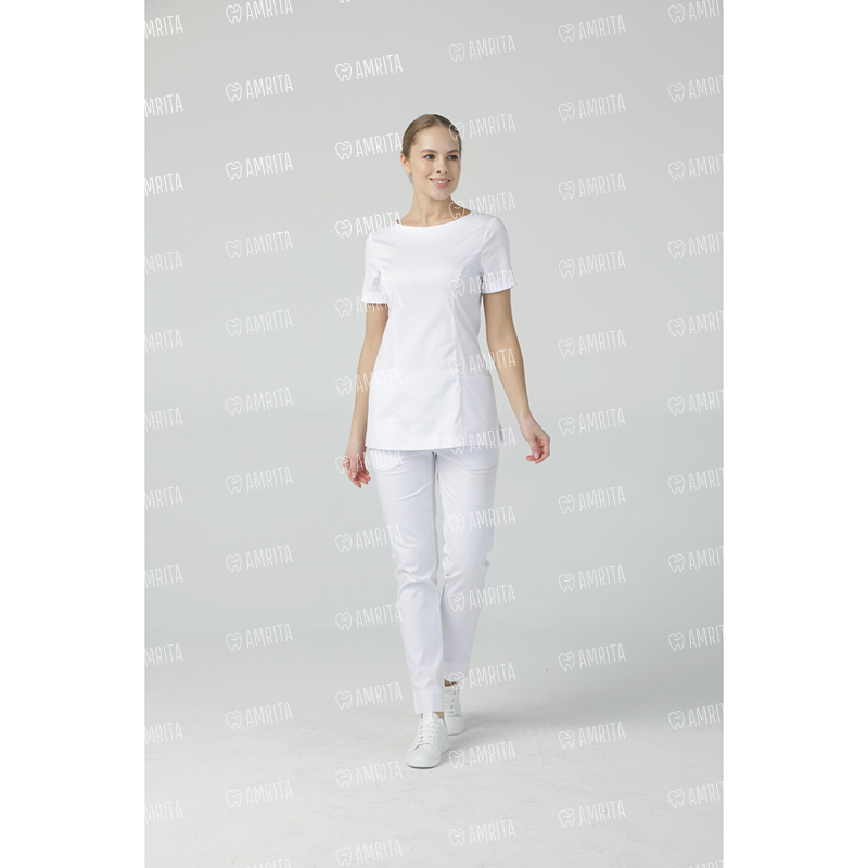 Брюки медицинские прямого кроя с эластичным поясом на резинке. Модель дополнена карманами в боковых швах, разрезами внизу и бантом из репсовой ленты на поясе.