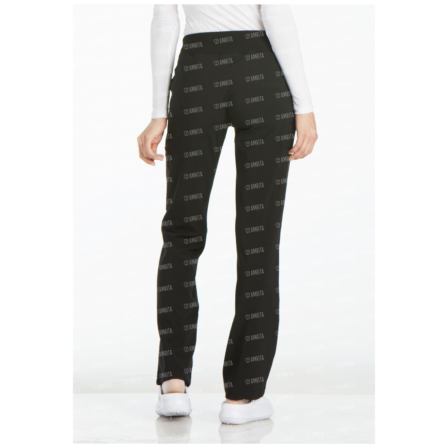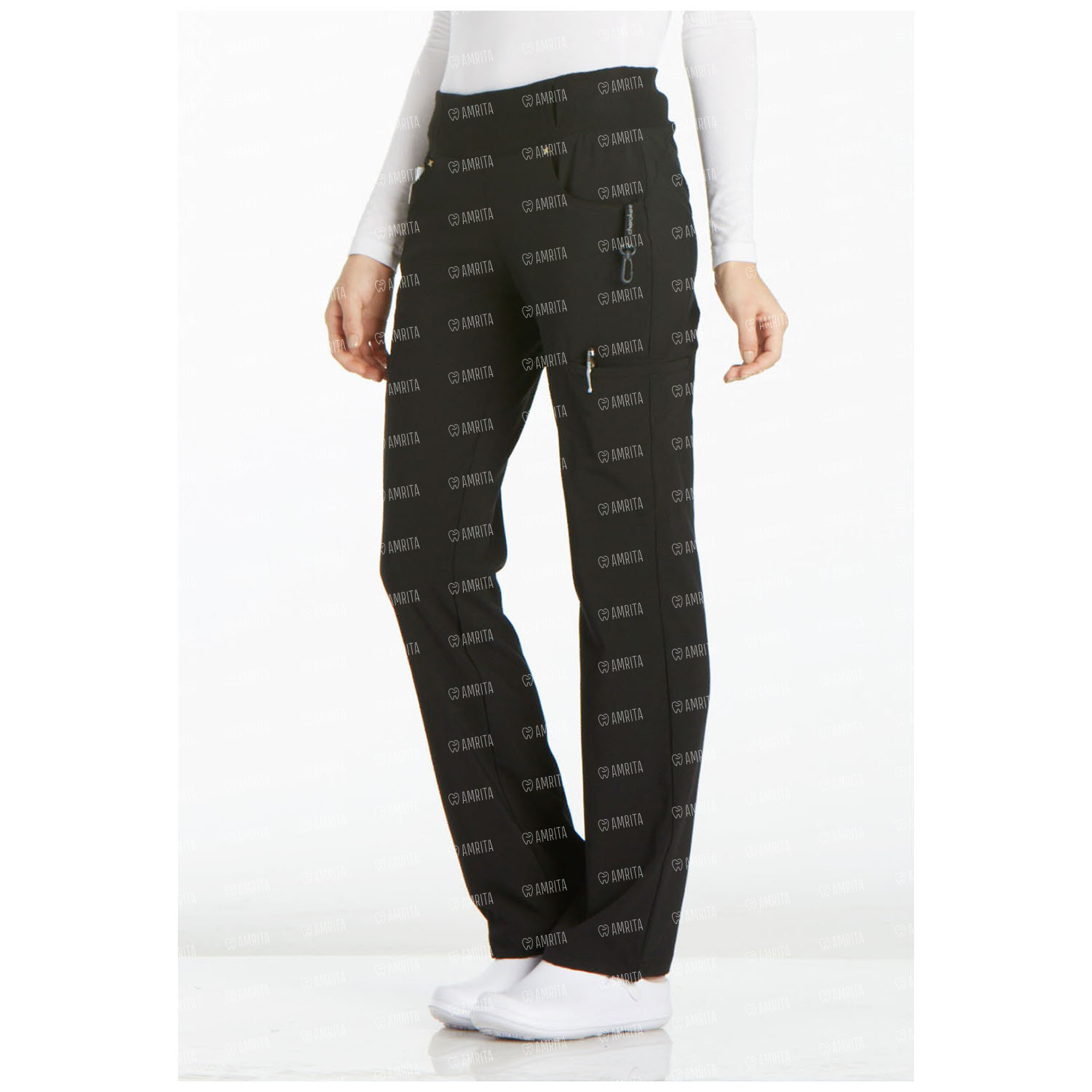 Медицинские женские брюки Cherokee CK002 выполнены в современном крое со средней посадкой и прямыми штанинами. У изделия имеется удобный трикотажный пояс, усиленный внутренней резинкой для дополнительной поддержки. Также предусмотрены передние круглые карманы с фирменными заклепками с логотипом, два прорезных грузовых кармана, потайной карман на поясе и карман для монет. У брюк есть специальный шнур, предназначенный для ношения бейджа и пластиковая застежка для ключей (внутри левого кармана).
