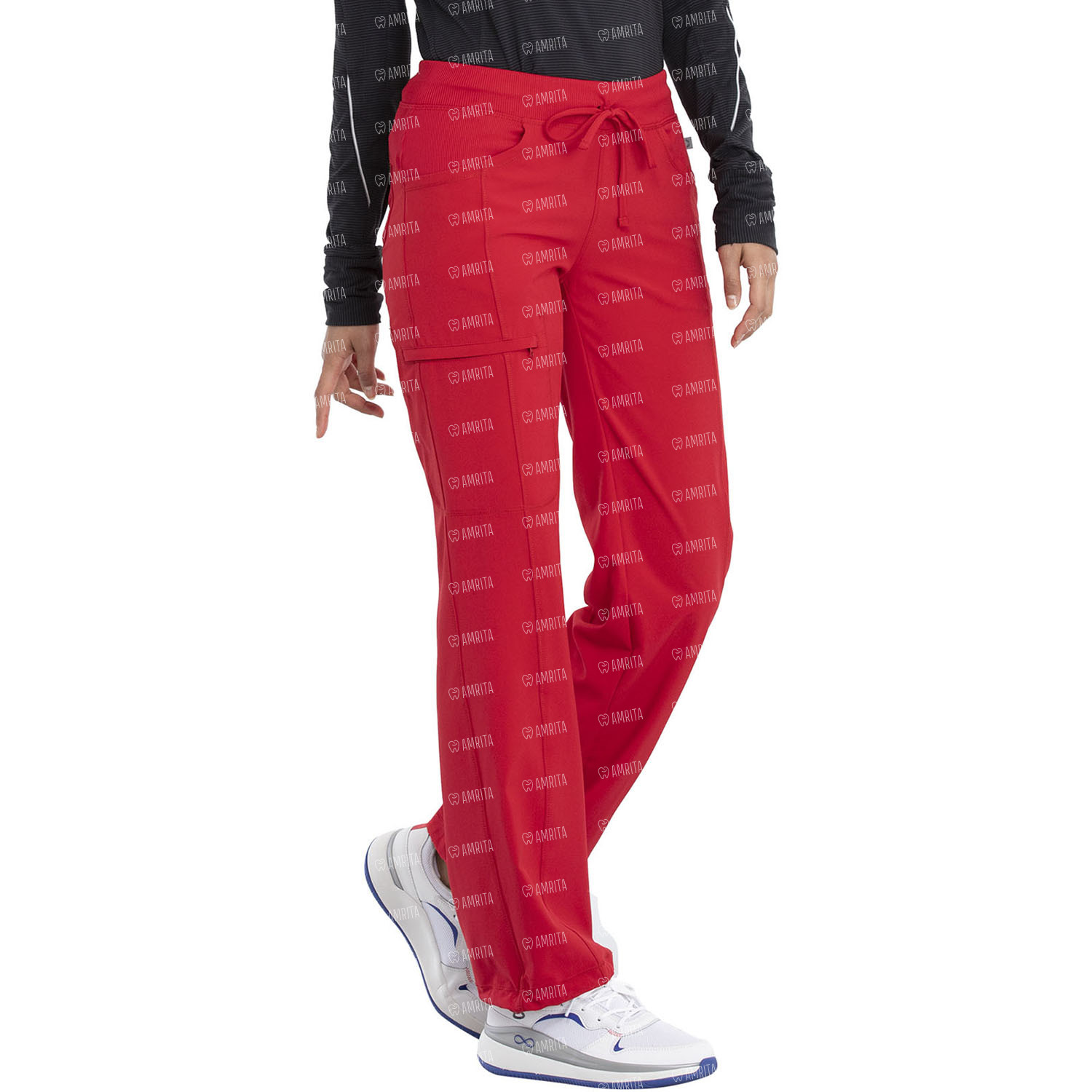 Женские медицинские брюки Cherokee 1123A выполнены в прямом современном крое, имеют заниженную талию и эластичный трикотажный пояс с регулируемой кулиской. На изделие есть передние и задние трикотажные кокетки в рубчик, угловые передние карманы, швы на передних штанинах с грузовым карманом на молнии, один накладной карман сзади, а также петля для инструментов с эластичной резинкой под левым карманом.