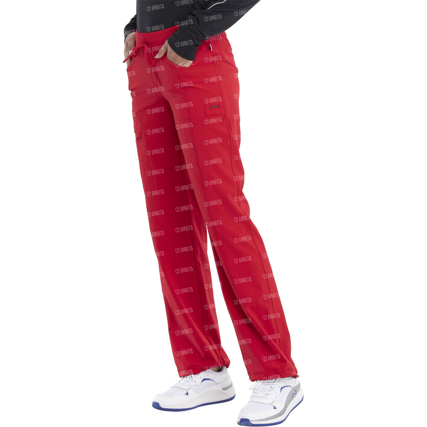 Женские медицинские брюки Cherokee 1123A выполнены в прямом современном крое, имеют заниженную талию и эластичный трикотажный пояс с регулируемой кулиской. На изделие есть передние и задние трикотажные кокетки в рубчик, угловые передние карманы, швы на передних штанинах с грузовым карманом на молнии, один накладной карман сзади, а также петля для инструментов с эластичной резинкой под левым карманом.