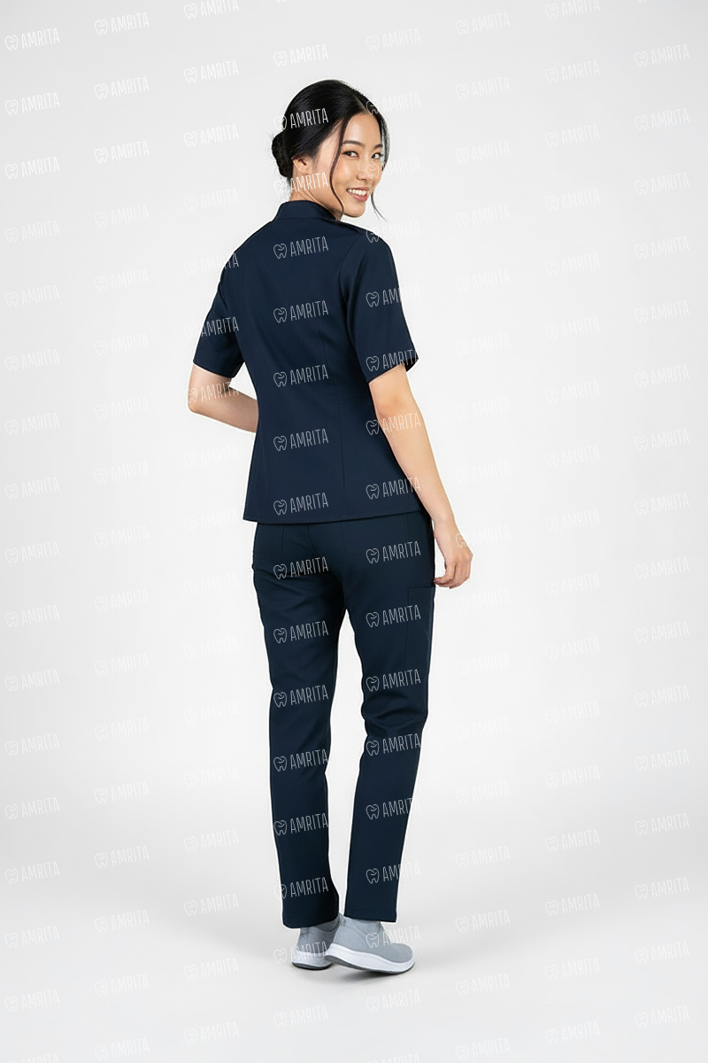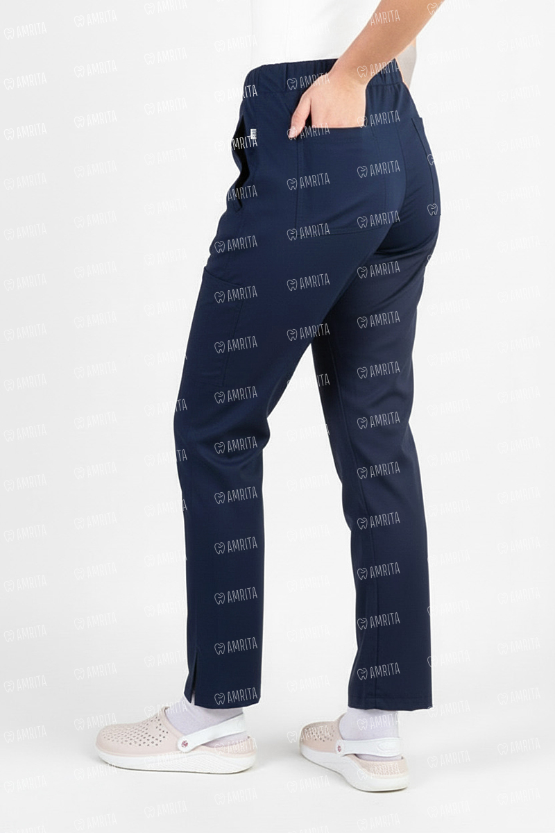 В основе дизайна — классический прямой крой, который служит универсальной базой для профессионального гардероба. Широкий эластичный пояс гарантирует идеальную посадку, а продуманная система из шести карманов обеспечивает максимальную функциональность. Разрезы по низу брючин служат продуманной деталью для дополнительного удобства.