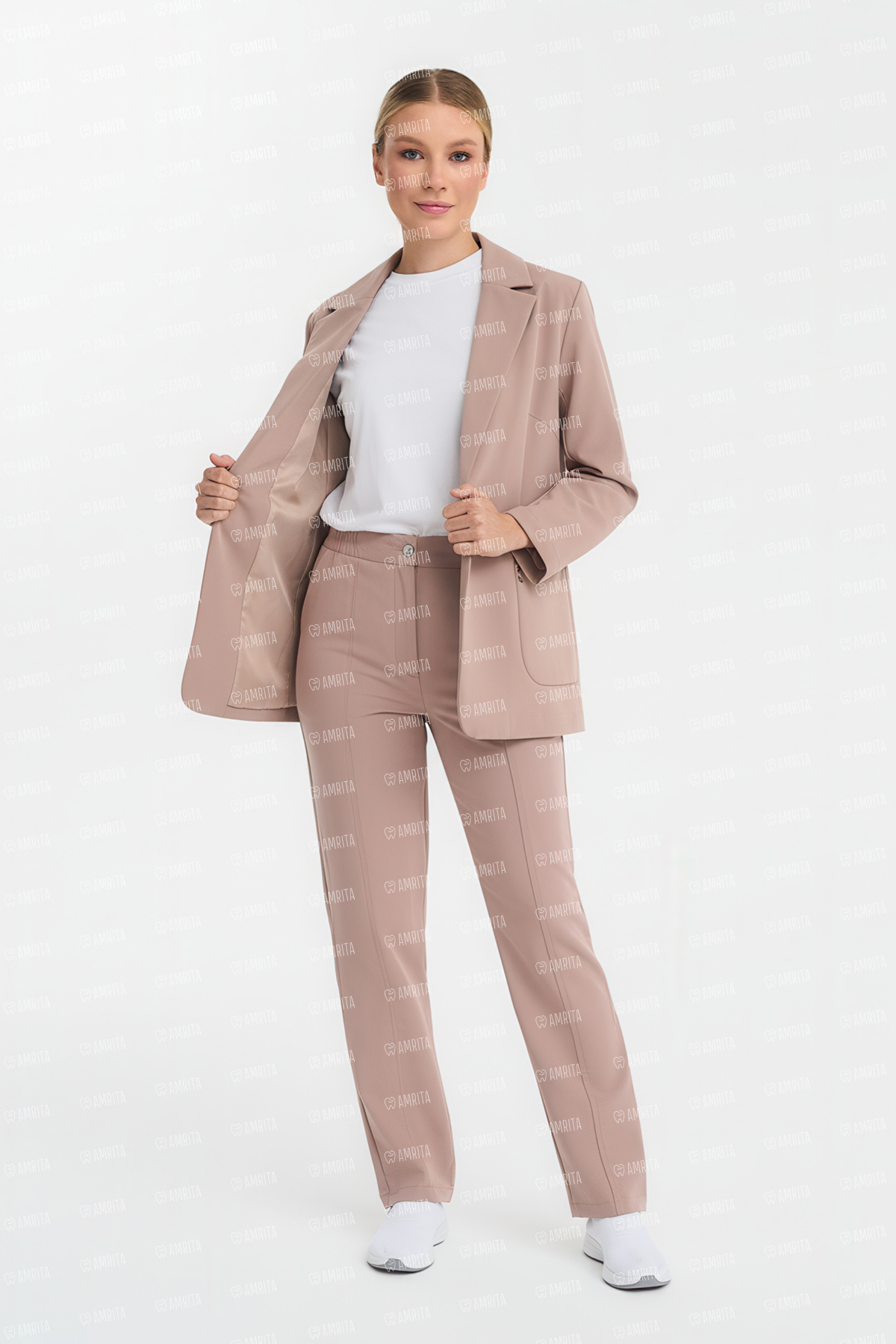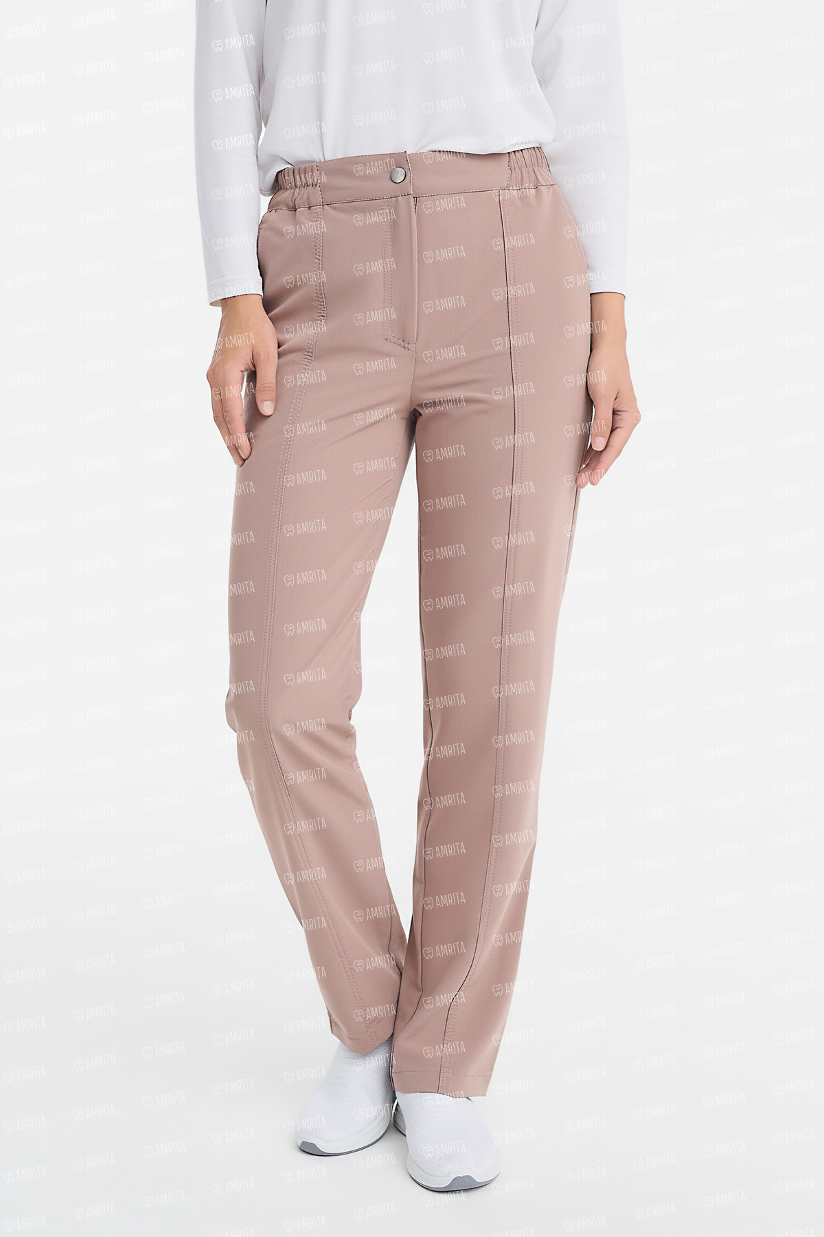 В основе дизайна — прямой крой, главным акцентом которого выступает отстроченная стрелка, формирующая безупречную вертикаль и визуально удлиняющая силуэт. Комбинированный пояс с эластичной вставкой сзади обеспечивает идеальную посадку на талии, а классическая застежка на молнию и пуговицу сохраняет строгий деловой вид.