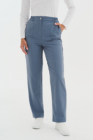 В основе дизайна — прямой крой, главным акцентом которого выступает отстроченная стрелка, формирующая безупречную вертикаль и визуально удлиняющая силуэт. Комбинированный пояс с эластичной вставкой сзади обеспечивает идеальную посадку на талии, а классическая застежка на молнию и пуговицу сохраняет строгий деловой вид.