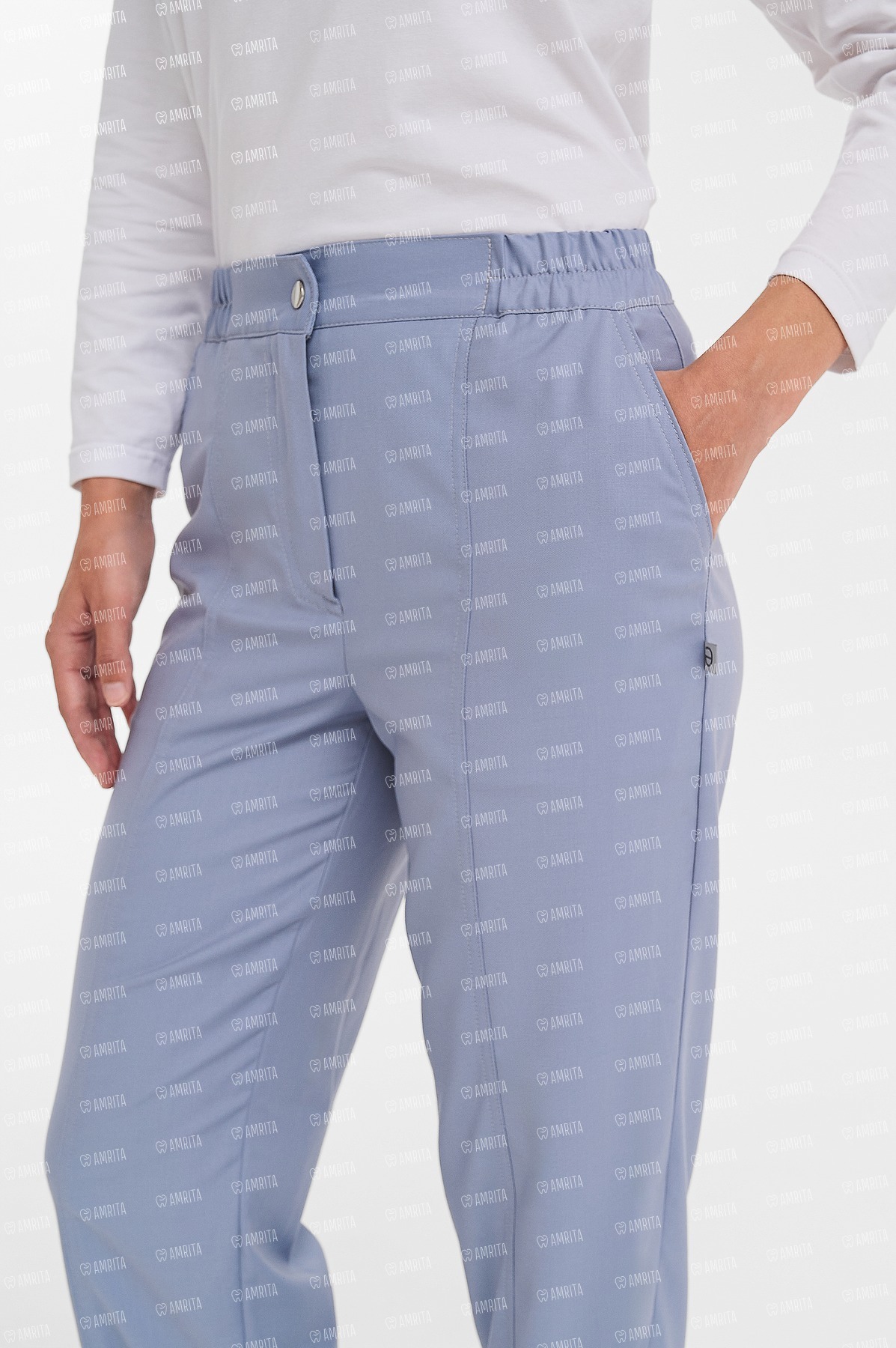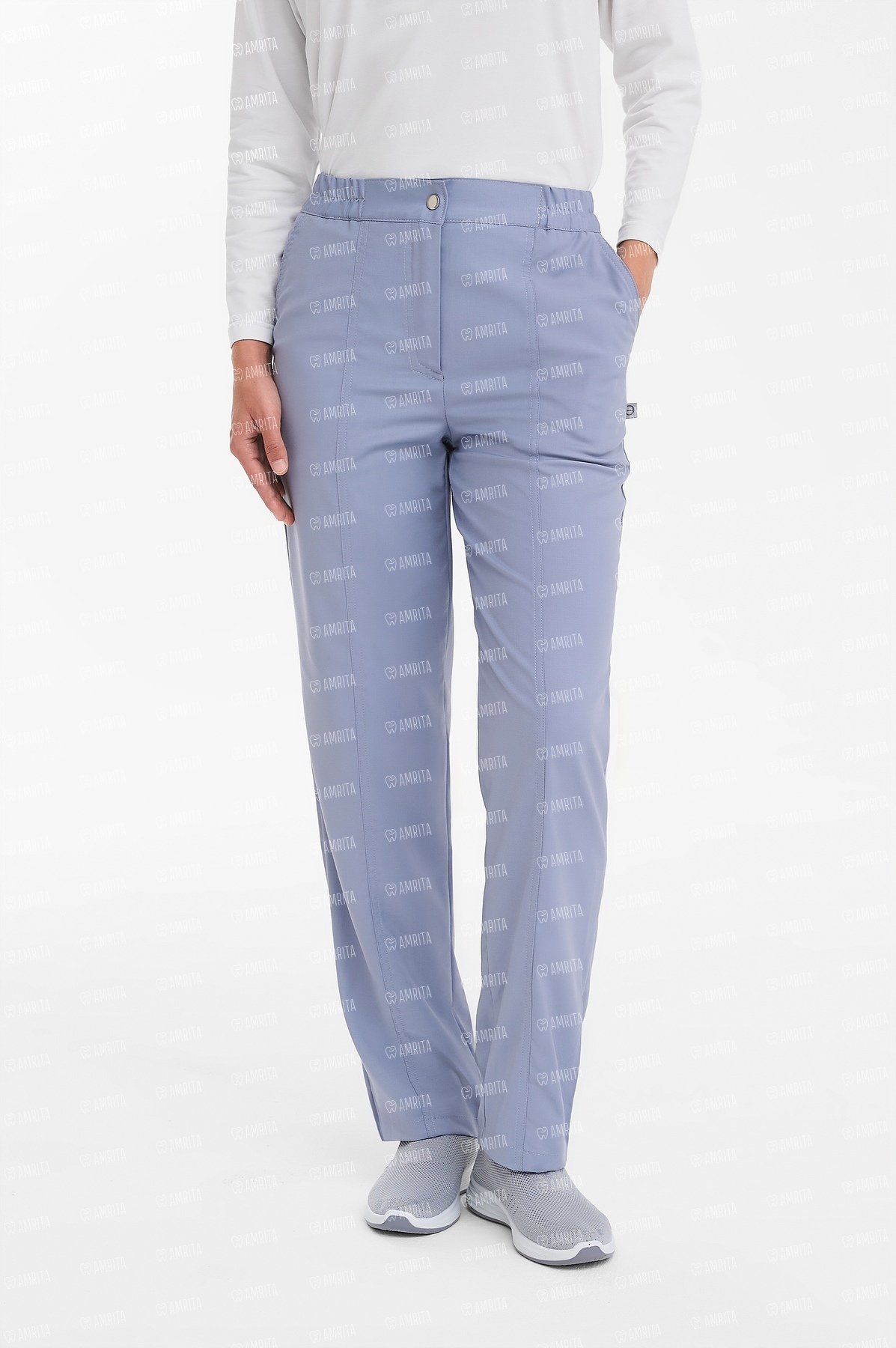 В основе дизайна — прямой крой, главным акцентом которого выступает отстроченная стрелка, формирующая безупречную вертикаль и визуально удлиняющая силуэт. Комбинированный пояс с эластичной вставкой сзади обеспечивает идеальную посадку на талии, а классическая застежка на молнию и пуговицу сохраняет строгий деловой вид.