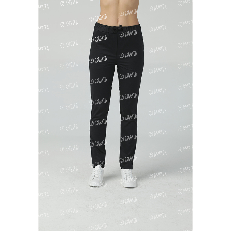 Брюки медицинские прямого кроя с эластичным поясом на резинке. Модель дополнена карманами в боковых швах, разрезами внизу и бантом из репсовой ленты на поясе.