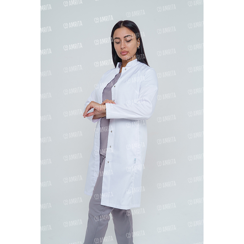 Женский медицинский халат 250 модели имеет прямой крой выше колена. Довольно классический вариант, который впишется в гардероб модницы любого возраста. Скрытая застежка на кнопках придает образу утонченности и женственности. Несмотря на прямой крой, фигура приобретает соблазнительные очертания благодаря пояску на двух кнопках. Модель оснащена карманами, скрытыми в боковых швах. Воротник стойка округлой формы добавит строгости униформе медработника.