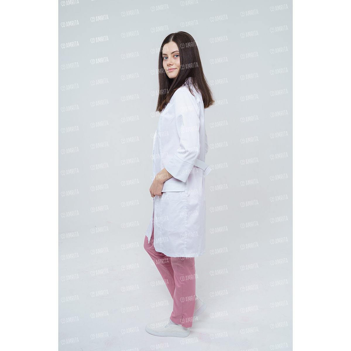 Женский халат бренда "Tezis" имеет прямой фасон, рукава 3/4 и классический воротник пиджачного типа. Изделие застегивается спереди на пуговицы, сзади есть шлица и ремешок для регулировки. Дополняет образ три кармана: два накладных по бокам и один прорезной на груди.