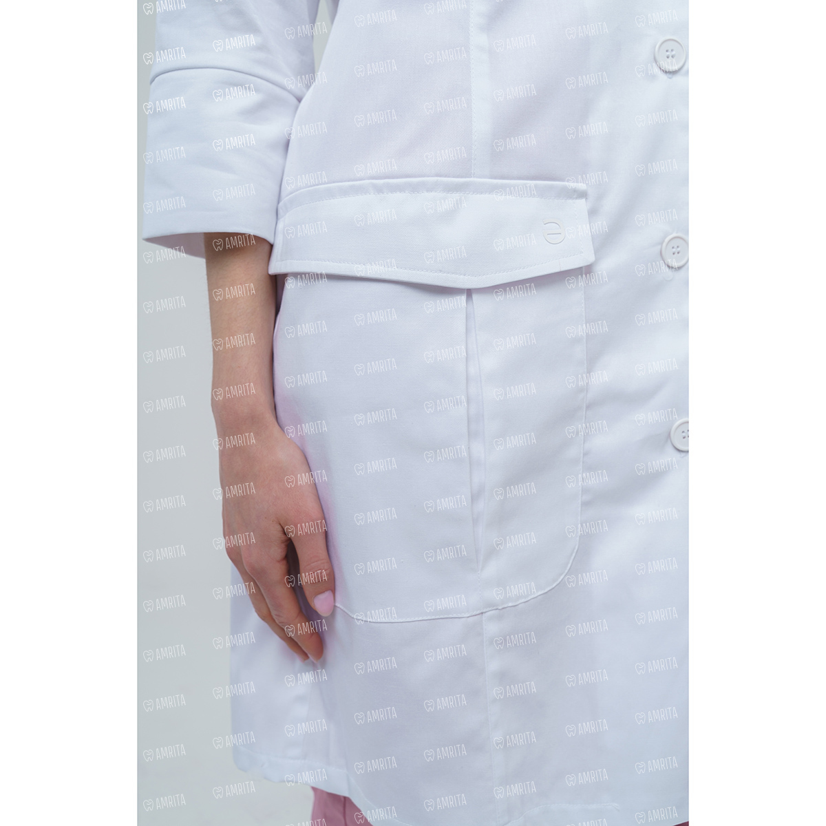 Женский халат бренда "Tezis" имеет прямой фасон, рукава 3/4 и классический воротник пиджачного типа. Изделие застегивается спереди на пуговицы, сзади есть шлица и ремешок для регулировки. Дополняет образ три кармана: два накладных по бокам и один прорезной на груди.