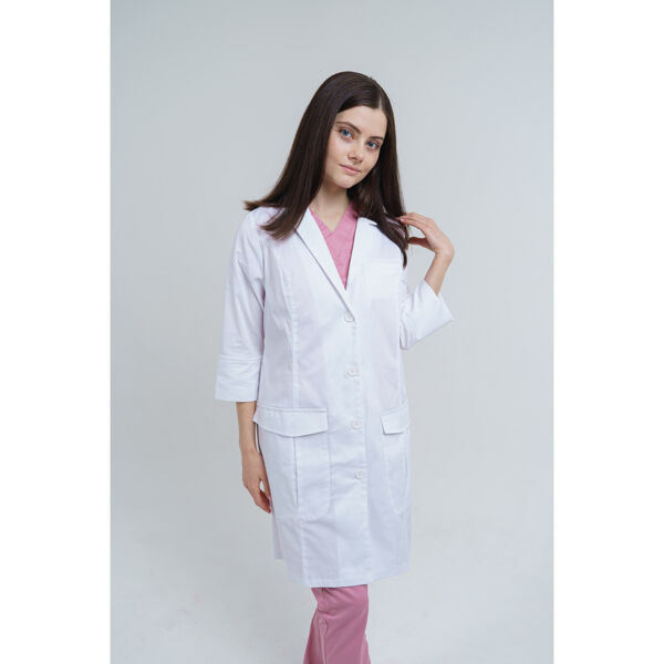 Женский халат бренда "Tezis" имеет прямой фасон, рукава 3/4 и классический воротник пиджачного типа. Изделие застегивается спереди на пуговицы, сзади есть шлица и ремешок для регулировки. Дополняет образ три кармана: два накладных по бокам и один прорезной на груди.