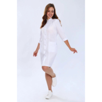 Длина выше линии колен и рукав три четверти обеспечивают комфортное использование хала и не стесняют движений во время работы. Рельефные вертикальные швы по спинке и полочке зрительно вытягивают силуэт. Тонкий кант, обрамляющий воротник, манжеты рукавов и карманы добавляет яркий акцент классическому медицинскому халату. Цвет канта можно подобрать на свой вкус. Воротник-стойка придают образу строгости и элегантности. Размерная сетка позволяет подобрать халат на фигуру до 60 размера включительно.