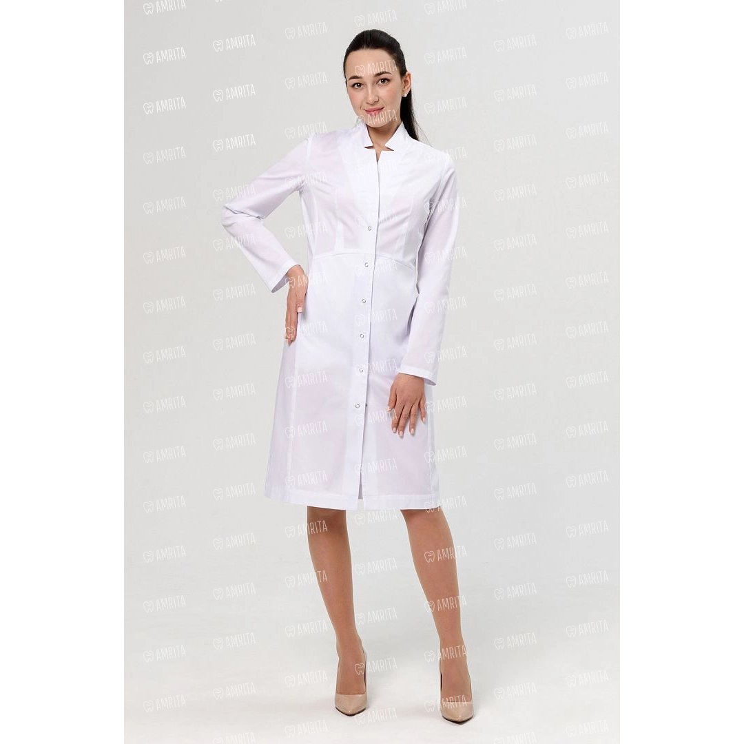 Элегантный женский халат прилегающего кроя длиной чуть ниже колена и широкой подгибкой снизу — воплощение стиля и изящности. Рельефные швы визуально удлиняют силуэт, делая его более стройным и легким. Спереди расположены два нижних кармана, предназначенные для хранения мелких предметов. Длинные рукава небольшого объема имеют застежку на кнопку по центру обеспечивают удобство и при использовании халата.