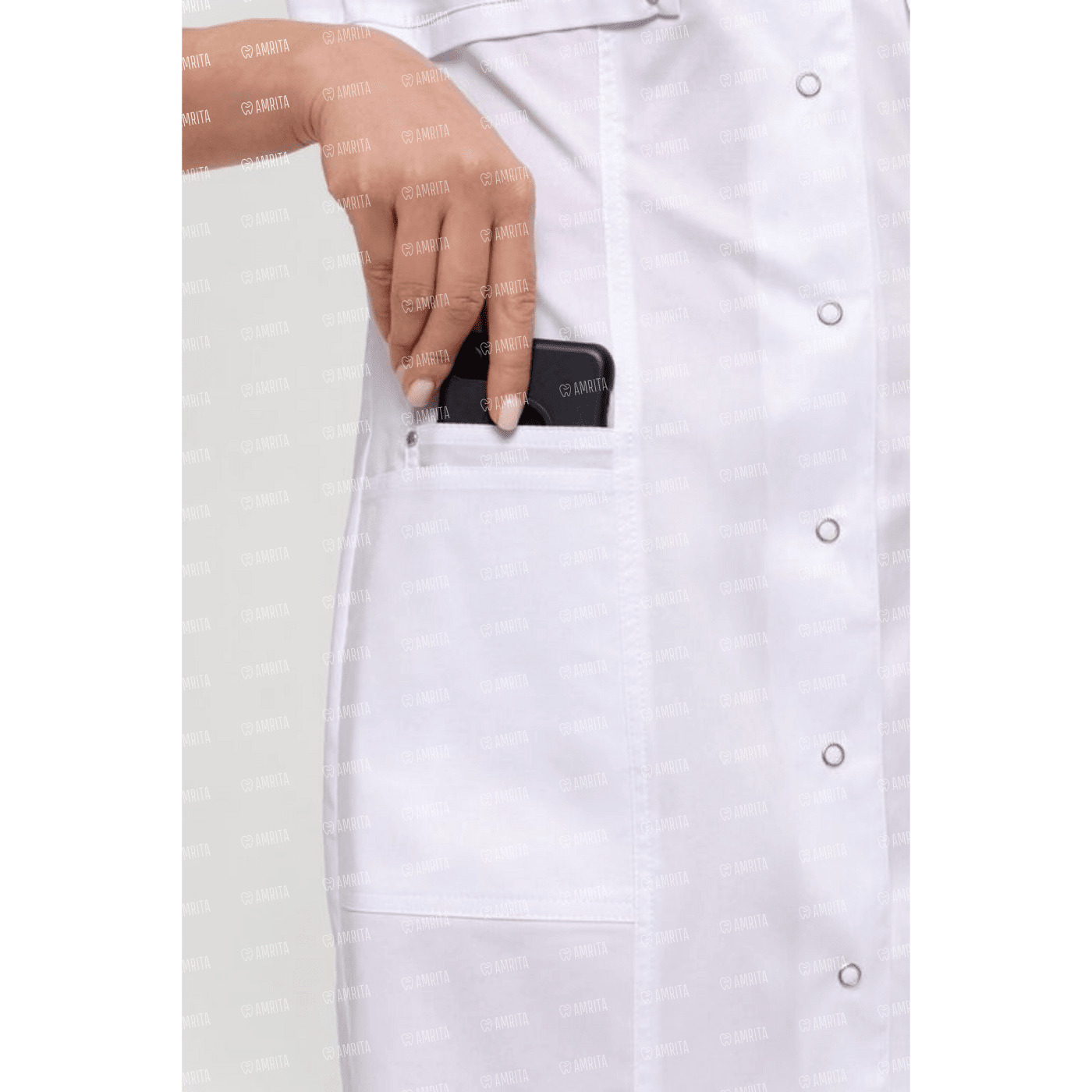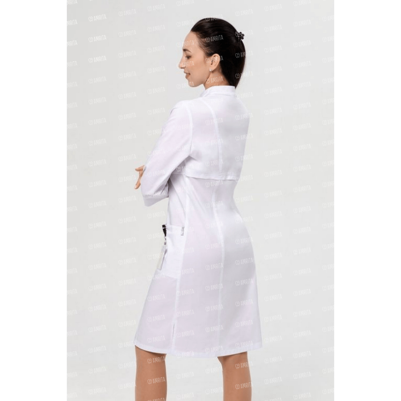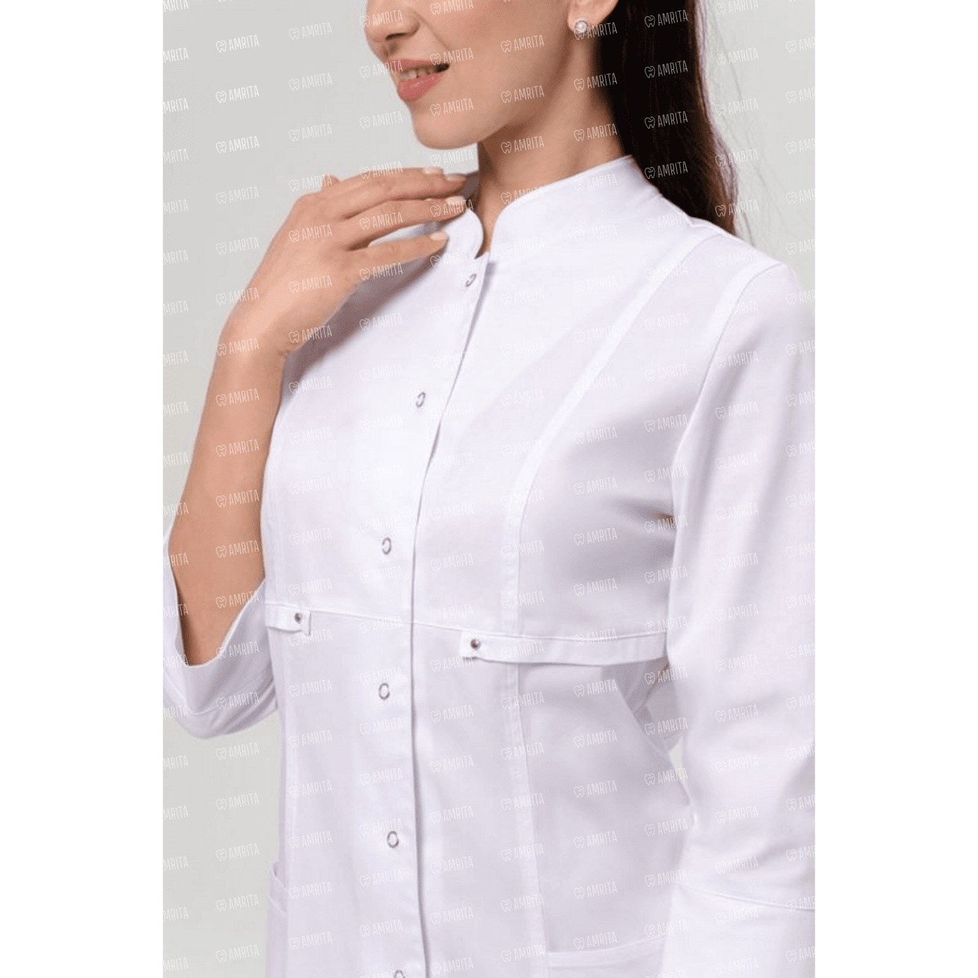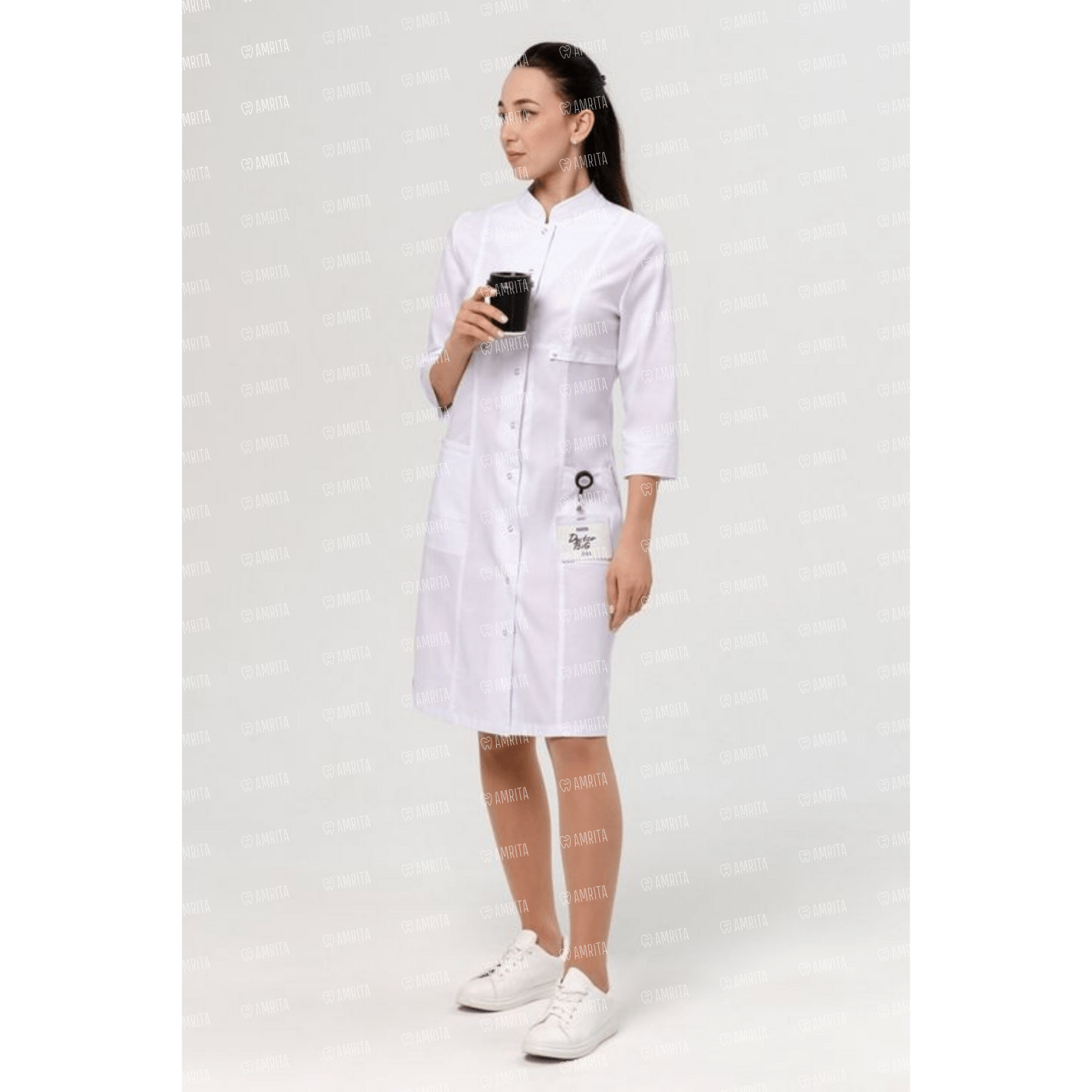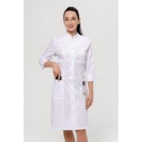 Медицинский халат полуприлегающего силуэта, отрезной чуть ниже линии груди. Вертикальные декоративные линии с двойной отстрочкой визуально вытягивают силуэт. Воротник-стойка. Два больших кармана, в одном из которых маленький кармашек для пропуска, телефона. Боковые разрезы обеспечивают комфорт при движении. Рукав ¾ с широкой манжетой, которую можно подвернуть для большего комфорта. Длина: до середины колена. Застежка на кнопки.