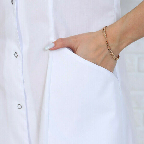 Укороченный женский медицинский халат подойдет для врача, мастера маникюра и медсестры. Халат на кнопках для работы в больнице, косметологов, стоматологов, как лабораторный халат. Большие размеры подарят комфорт для высоких девушек, а хлопок в составе ткани позволит носить плотный медицинский халат всю смену в больнице и не чувствовать неудобство.