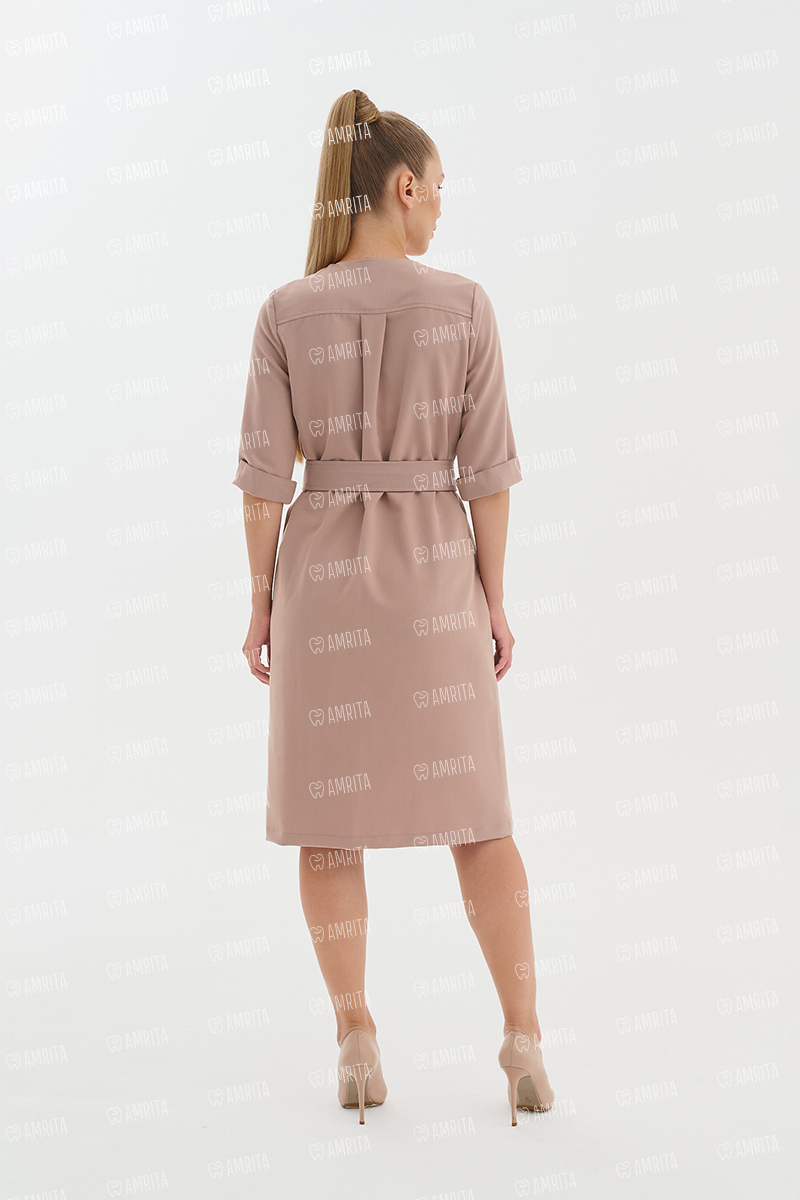 В основе дизайна — чистые линии и отсутствие визуального шума. Крой на запáх формирует женственный силуэт «песочные часы» и красивую линию декольте. Стильная металлическая пряжка на талии выполняет двойную функцию: надежно фиксирует посадку по фигуре, а также служит лаконичным украшением. Рукав ¾ — практичное решение, которое не мешает при выполнении медицинских манипуляций.
