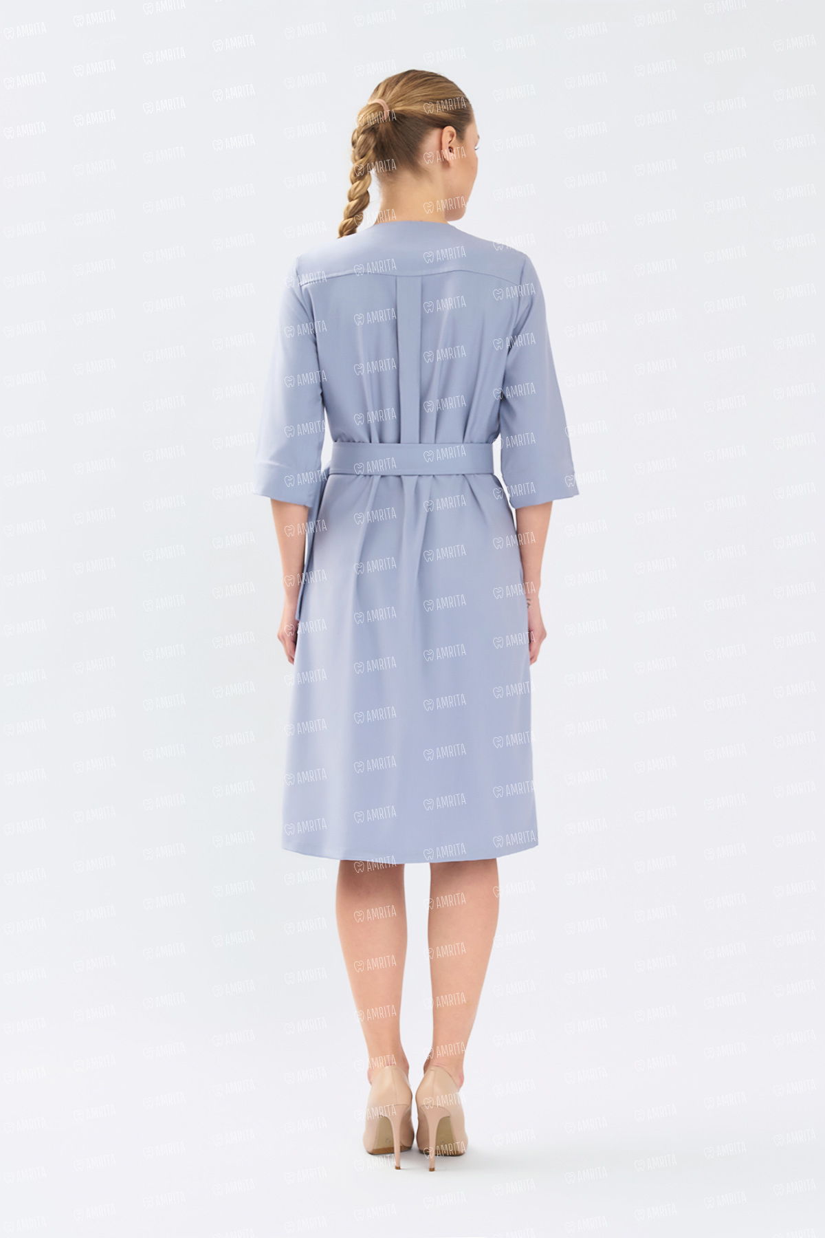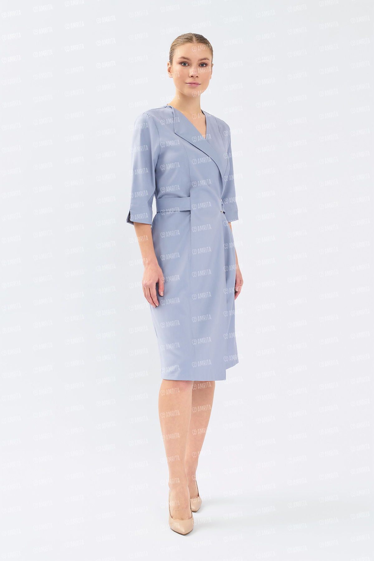В основе дизайна — чистые линии и отсутствие визуального шума. Крой на запáх формирует женственный силуэт «песочные часы» и красивую линию декольте. Стильная металлическая пряжка на талии выполняет двойную функцию: надежно фиксирует посадку по фигуре, а также служит лаконичным украшением. Рукав ¾ — практичное решение, которое не мешает при выполнении медицинских манипуляций.
