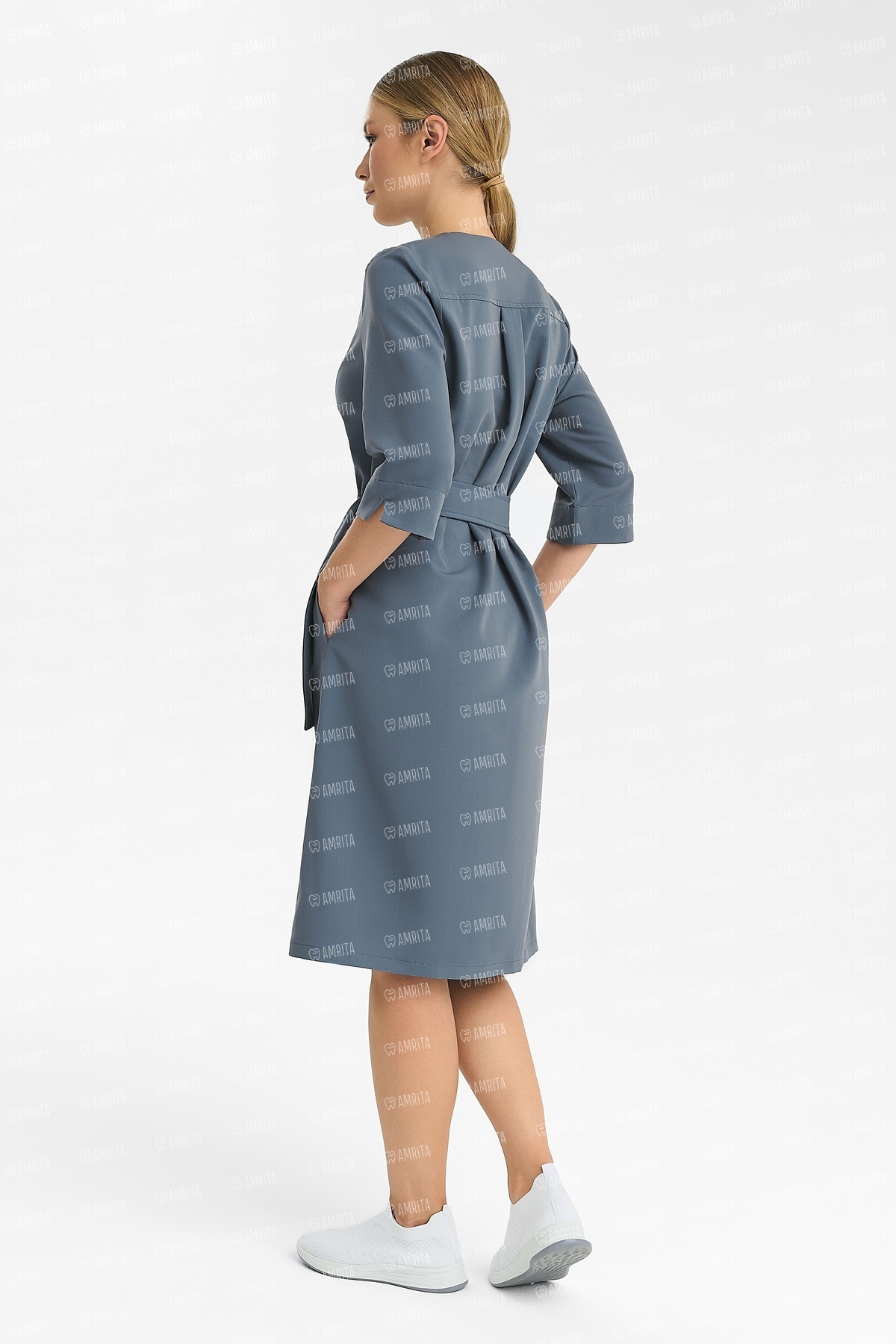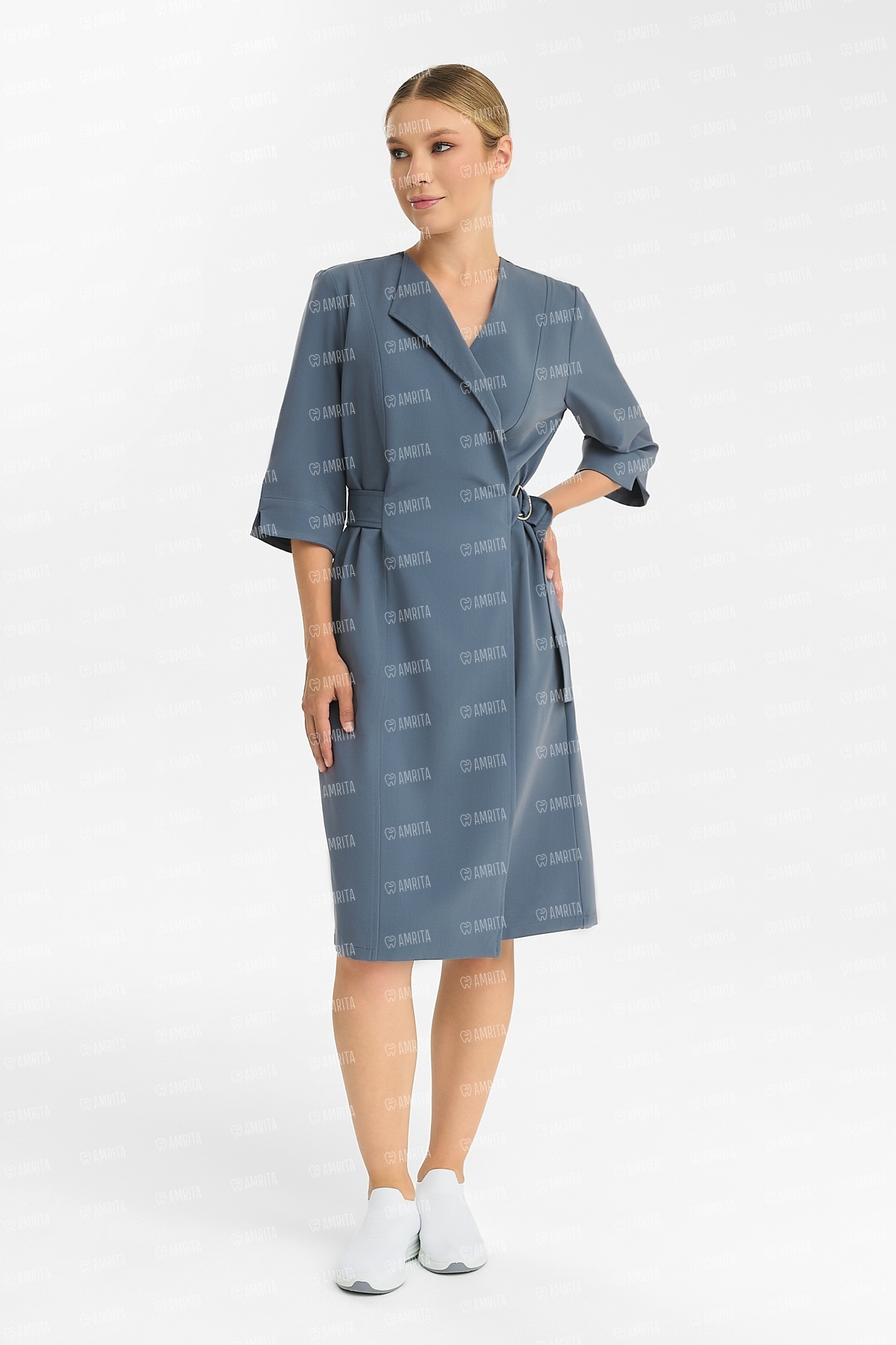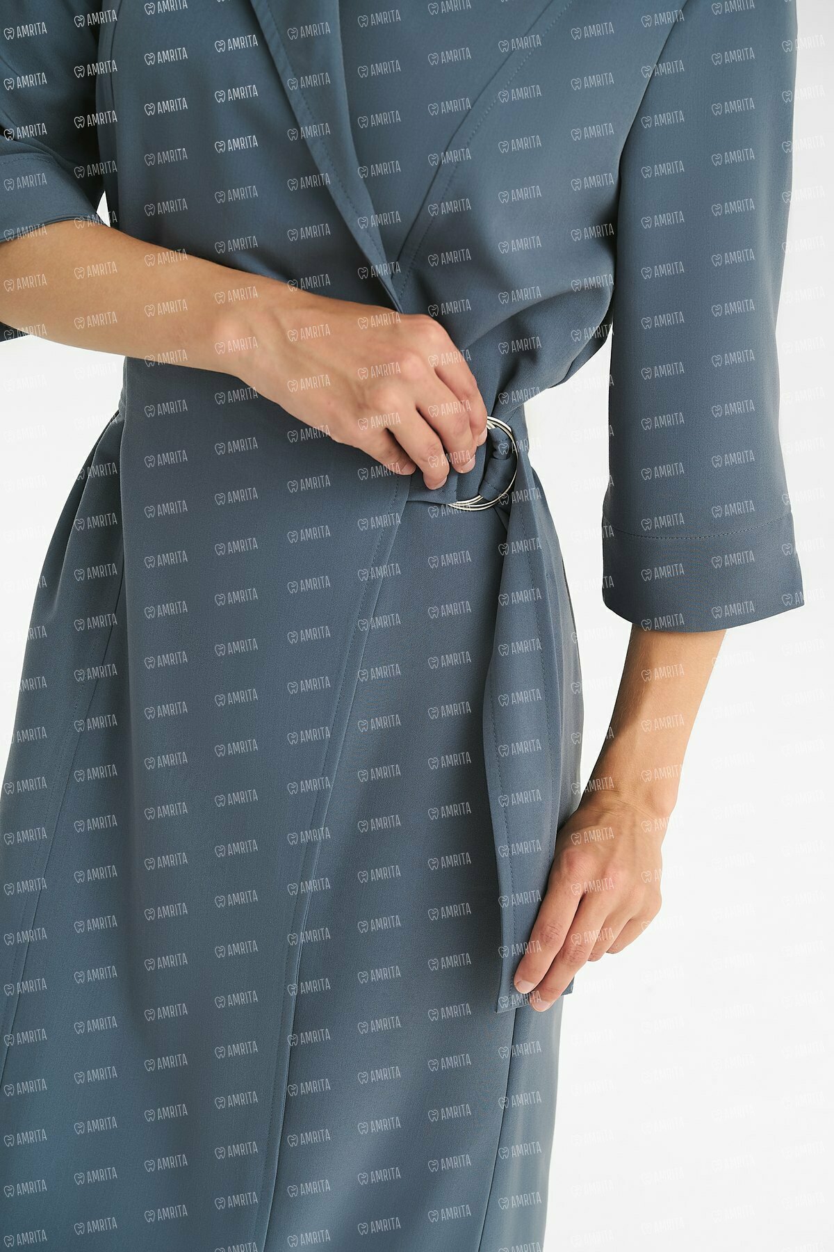 В основе дизайна — чистые линии и отсутствие визуального шума. Крой на запáх формирует женственный силуэт «песочные часы» и красивую линию декольте. Стильная металлическая пряжка на талии выполняет двойную функцию: надежно фиксирует посадку по фигуре, а также служит лаконичным украшением. Рукав ¾ — практичное решение, которое не мешает при выполнении медицинских манипуляций.