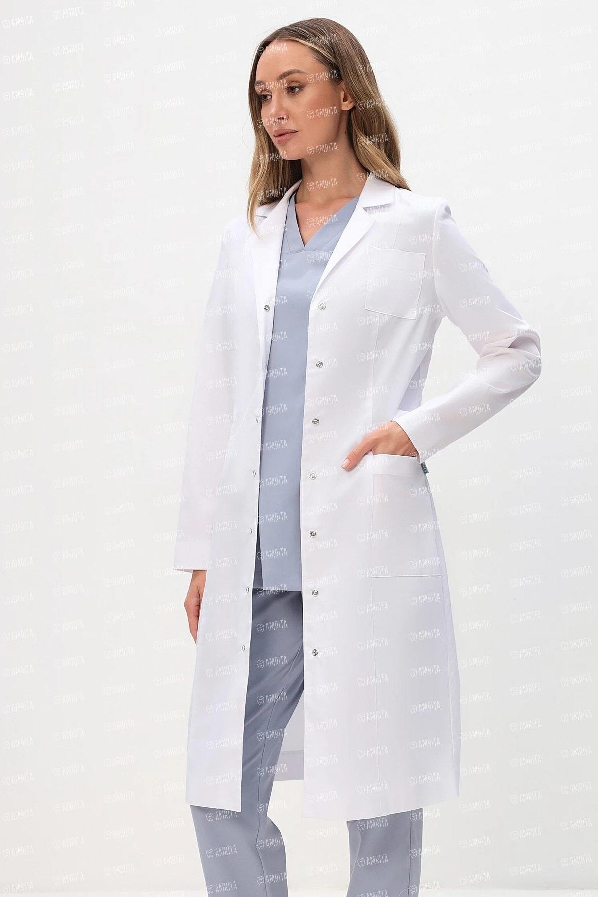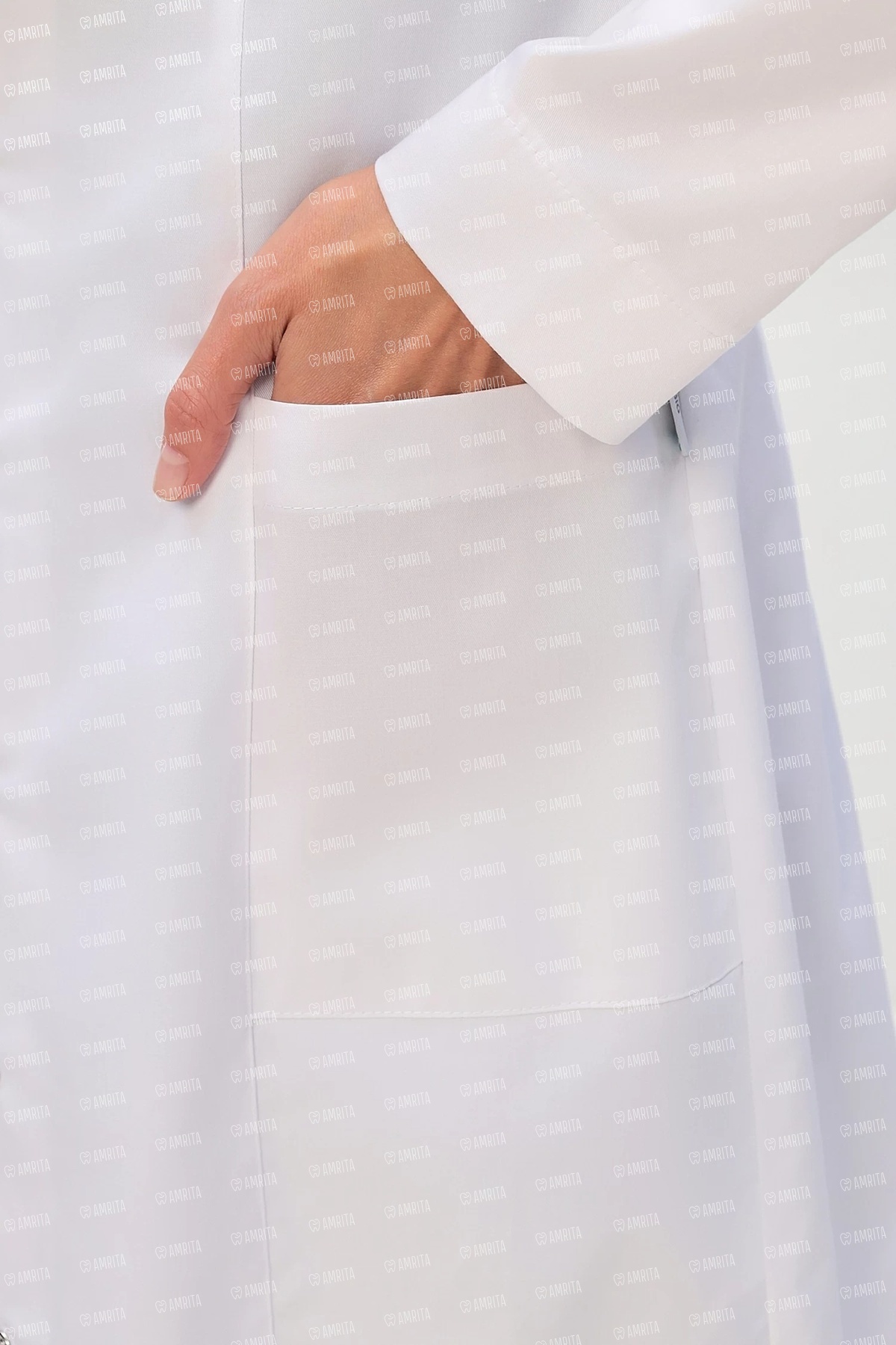 - Практичность и комфорт: Халат оснащен тремя накладными карманами (нагрудным и двумя боковыми) для необходимых в работе вещей. Ткань устойчива к сминанию и сохраняет форму в течение всей смены.