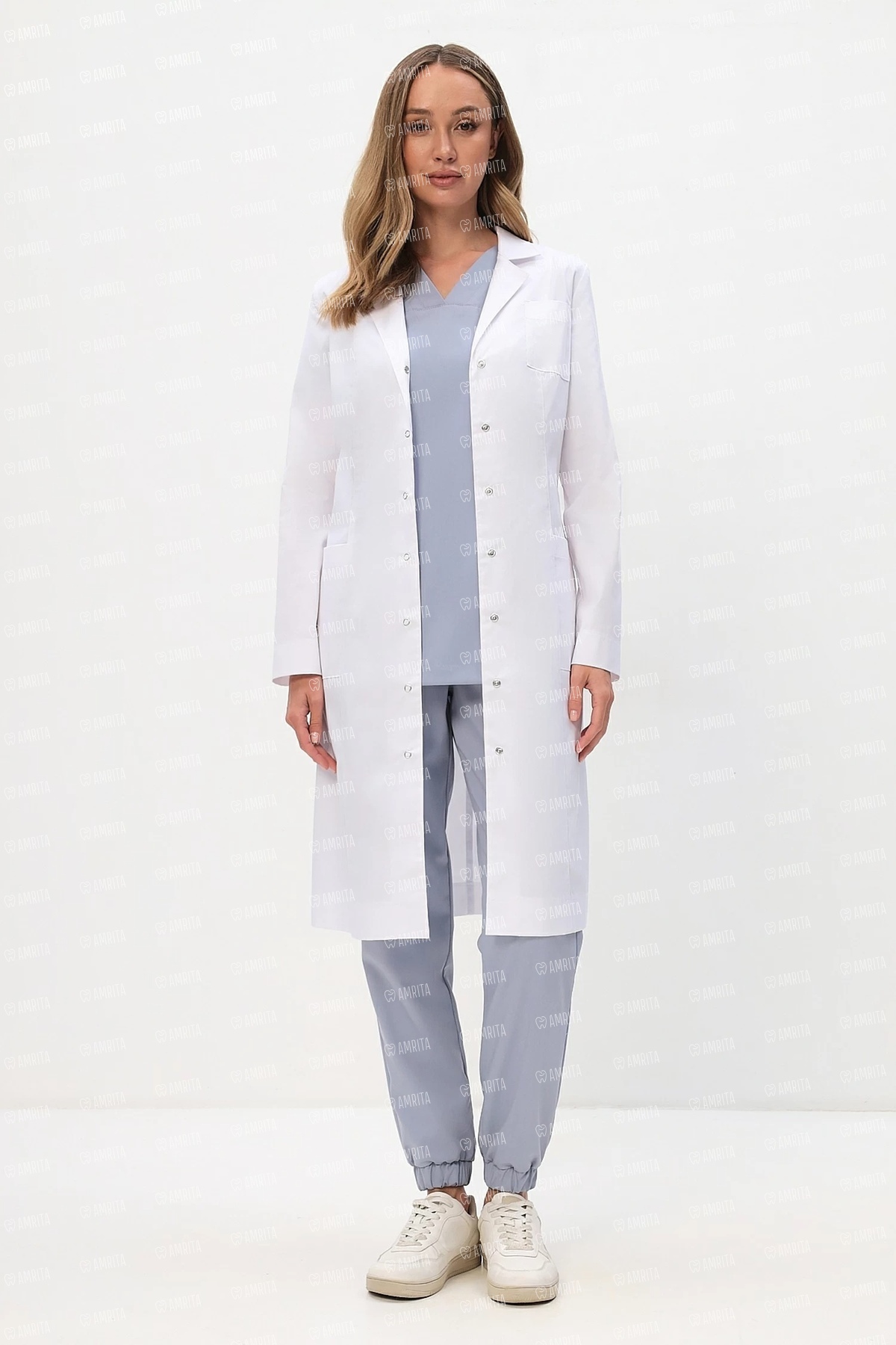 - Эталонный стиль: Классический английский воротник и застежка на семь надежных кнопок создают сдержанный, авторитетный образ, подходящий для врачей любой специальности.