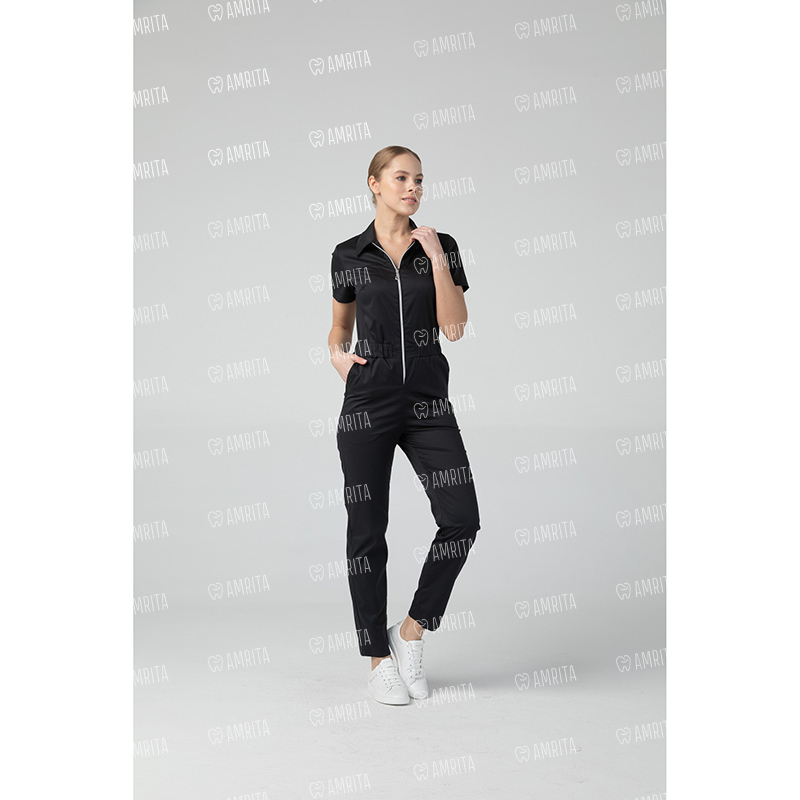 Женский медицинский комбинезон Dr.Nice выполнен в оригинальном стиле с застежкой-молнией спереди, отложным воротником и коротким рукавом. Модель дополняет два боковых кармана и резинка по линии талии.