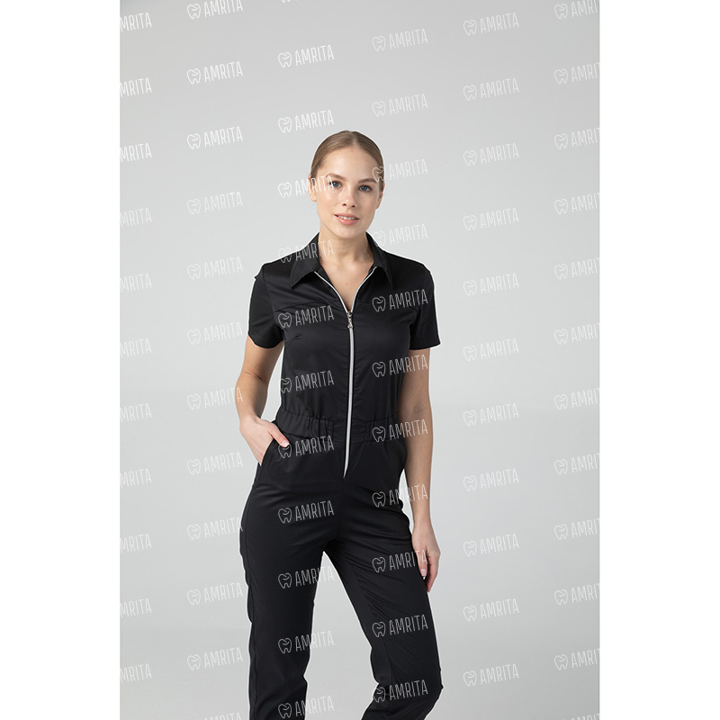 Женский медицинский комбинезон Dr.Nice выполнен в оригинальном стиле с застежкой-молнией спереди, отложным воротником и коротким рукавом. Модель дополняет два боковых кармана и резинка по линии талии.