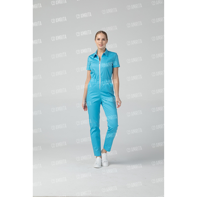Женский медицинский комбинезон Dr.Nice выполнен в оригинальном стиле с застежкой-молнией спереди, отложным воротником и коротким рукавом. Модель дополняет два боковых кармана и резинка по линии талии.