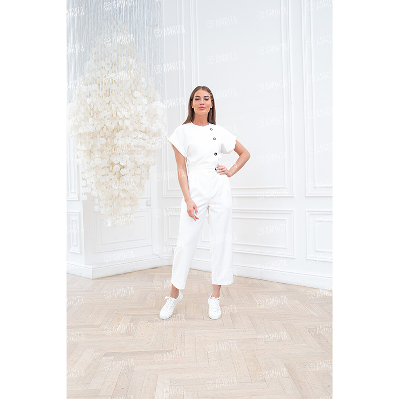 Женский двубортный комбинезон из коллекции Beauty бренда Dr.Nice имеет приталенный фасон, короткие рукава и застегивается на контрастные пуговицы спереди. Модель дополнена боковыми карманами.