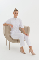 В основе дизайна — приталенный силуэт, акцентированный эластичным поясом со шлевками. Ключевым элементом выступает фигурная кокетка спереди и сзади, которая формирует динамичную и четкую геометрию верха. Воротник-стойка и центральная молния с кольцом-пуллером поддерживают строгий и лаконичный характер модели. Рукав длиной ¾ с широкими манжетами добавляет образу элегантности и завершенности.