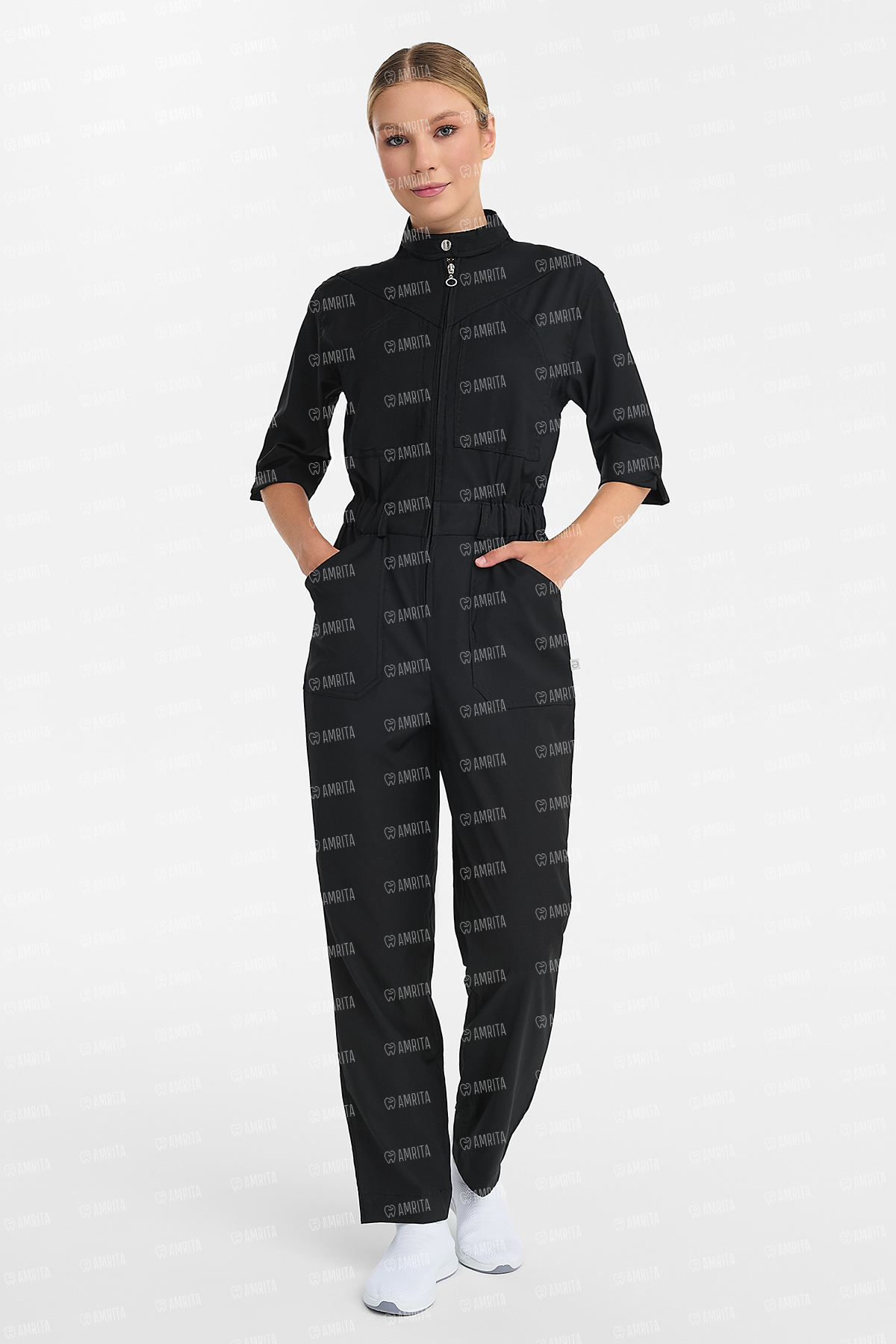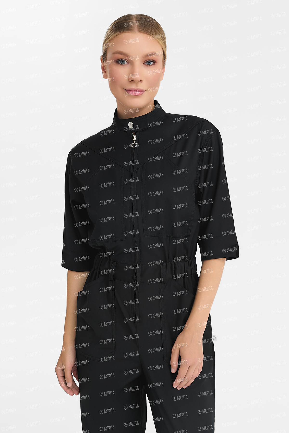 В основе дизайна — приталенный силуэт, акцентированный эластичным поясом со шлевками. Ключевым элементом выступает фигурная кокетка спереди и сзади, которая формирует динамичную и четкую геометрию верха. Воротник-стойка и центральная молния с кольцом-пуллером поддерживают строгий и лаконичный характер модели. Рукав длиной ¾ с широкими манжетами добавляет образу элегантности и завершенности.