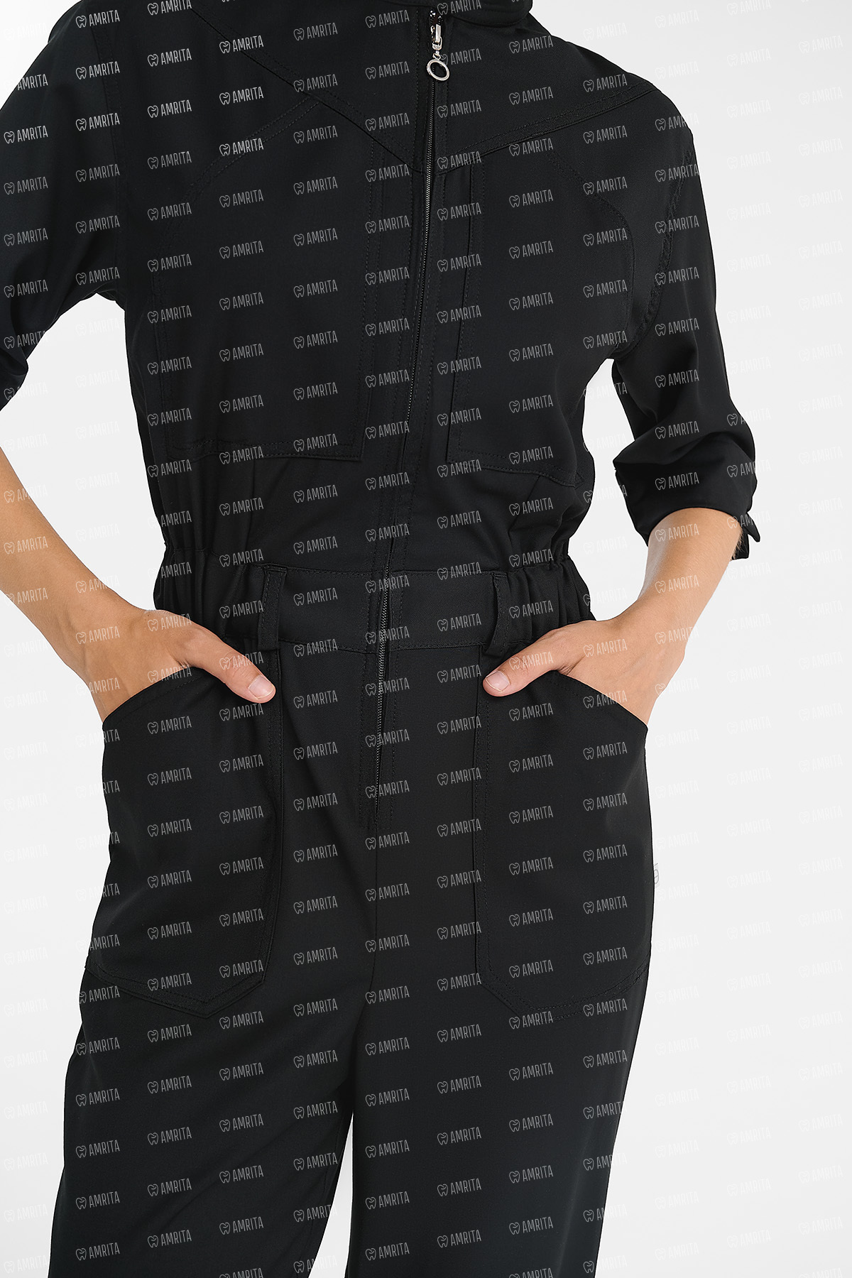 В основе дизайна — приталенный силуэт, акцентированный эластичным поясом со шлевками. Ключевым элементом выступает фигурная кокетка спереди и сзади, которая формирует динамичную и четкую геометрию верха. Воротник-стойка и центральная молния с кольцом-пуллером поддерживают строгий и лаконичный характер модели. Рукав длиной ¾ с широкими манжетами добавляет образу элегантности и завершенности.