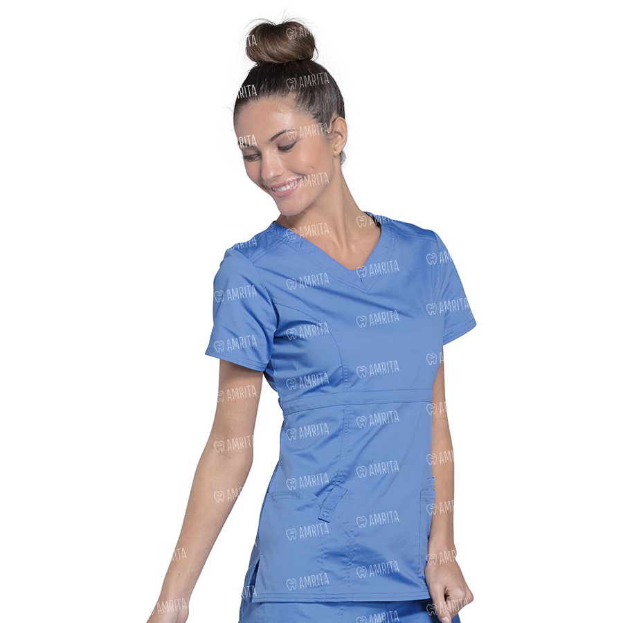 Женский медицинский топ Cherokee 24703 с завышенной талией выполнен в современном стиле и имеет закругленный V-образный вырез со вставкой в виде манишки, кокетки на плечах спереди, а также швы с отстрочкой спереди и сзади. У изделия имеется также два накладных кармана: в левом есть дополнительный вместительный карман для мобильного телефона, а в правом — отделение для ручки с петлей из саржевой ленты и функциональной кнопкой. Двойная строчка и боковые разрезы дополняют этот топ.