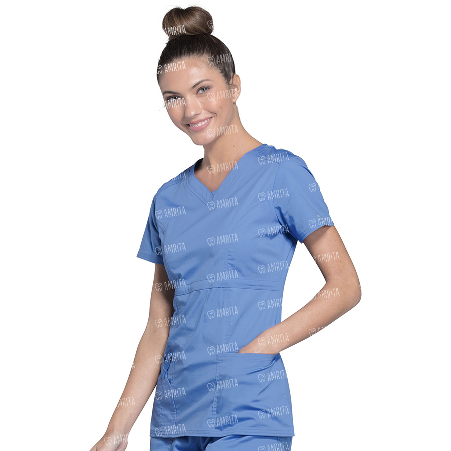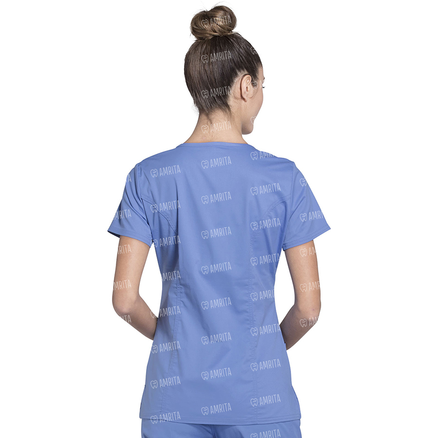 Женский медицинский топ Cherokee 24703 с завышенной талией выполнен в современном стиле и имеет закругленный V-образный вырез со вставкой в виде манишки, кокетки на плечах спереди, а также швы с отстрочкой спереди и сзади. У изделия имеется также два накладных кармана: в левом есть дополнительный вместительный карман для мобильного телефона, а в правом — отделение для ручки с петлей из саржевой ленты и функциональной кнопкой. Двойная строчка и боковые разрезы дополняют этот топ.