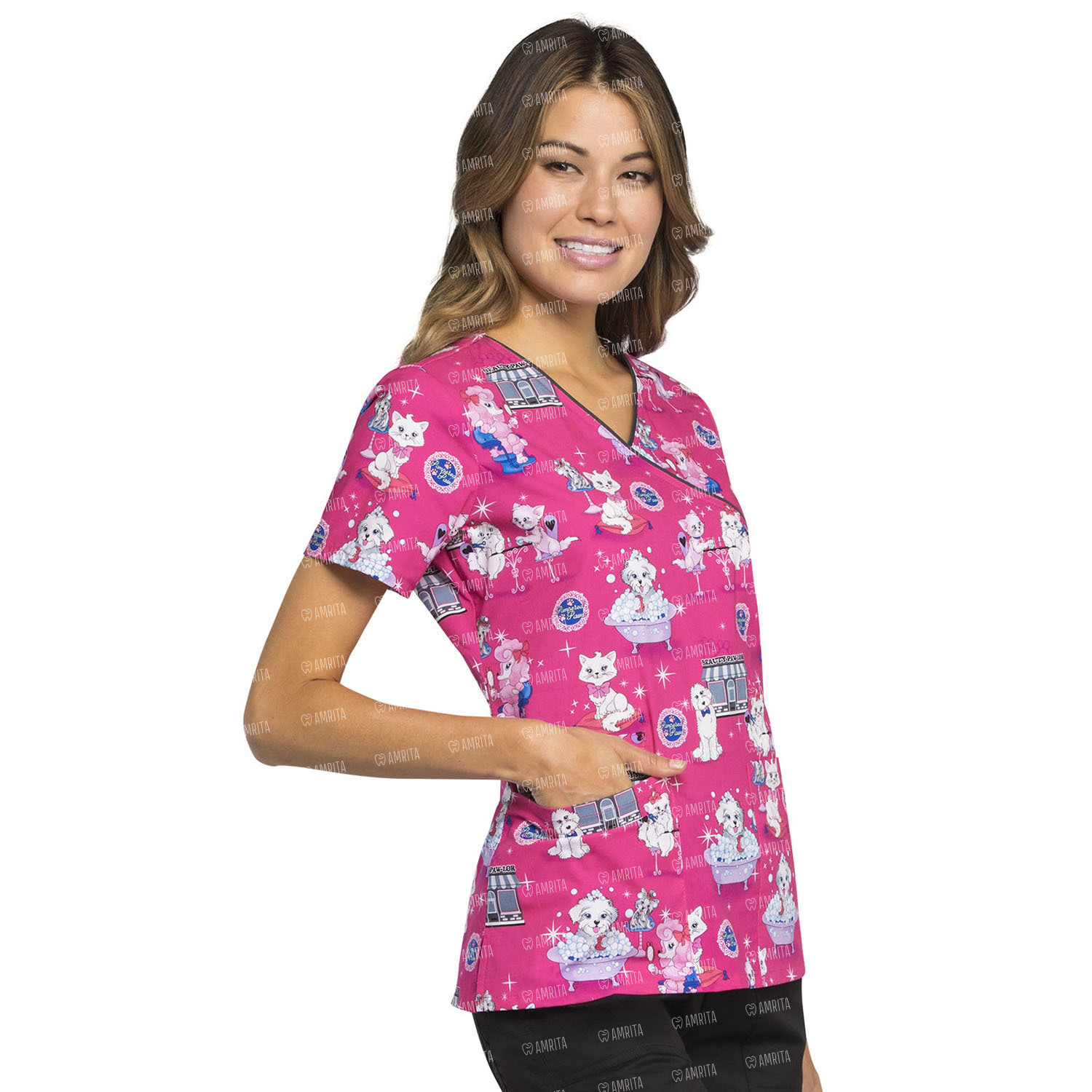 Женский медицинский топ CK614 с запахом бренда Cherokee имеет контрастную окантовку по вырезу, два накладных кармана, петлю для инструментов и боковые разрезы для удобства движений.