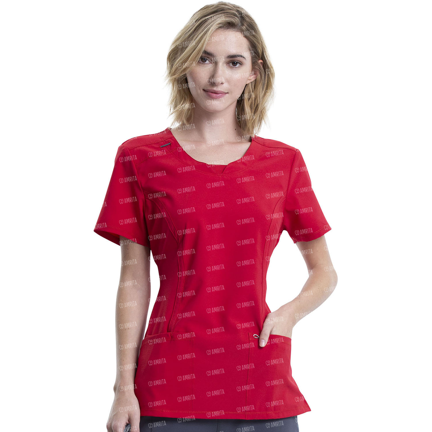 Топ женский от производителя Cherokee 2624A имеет современный крой, круглый вырез с трикотажной вставкой на передней части шеи, а также плечевые кокетки, петлю для банджи-бейджа на правом плече, швы в виде принцессы спереди и сзади, два накладных кармана, один внутренний карман и боковые вентиляционные отверстия.