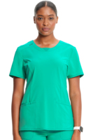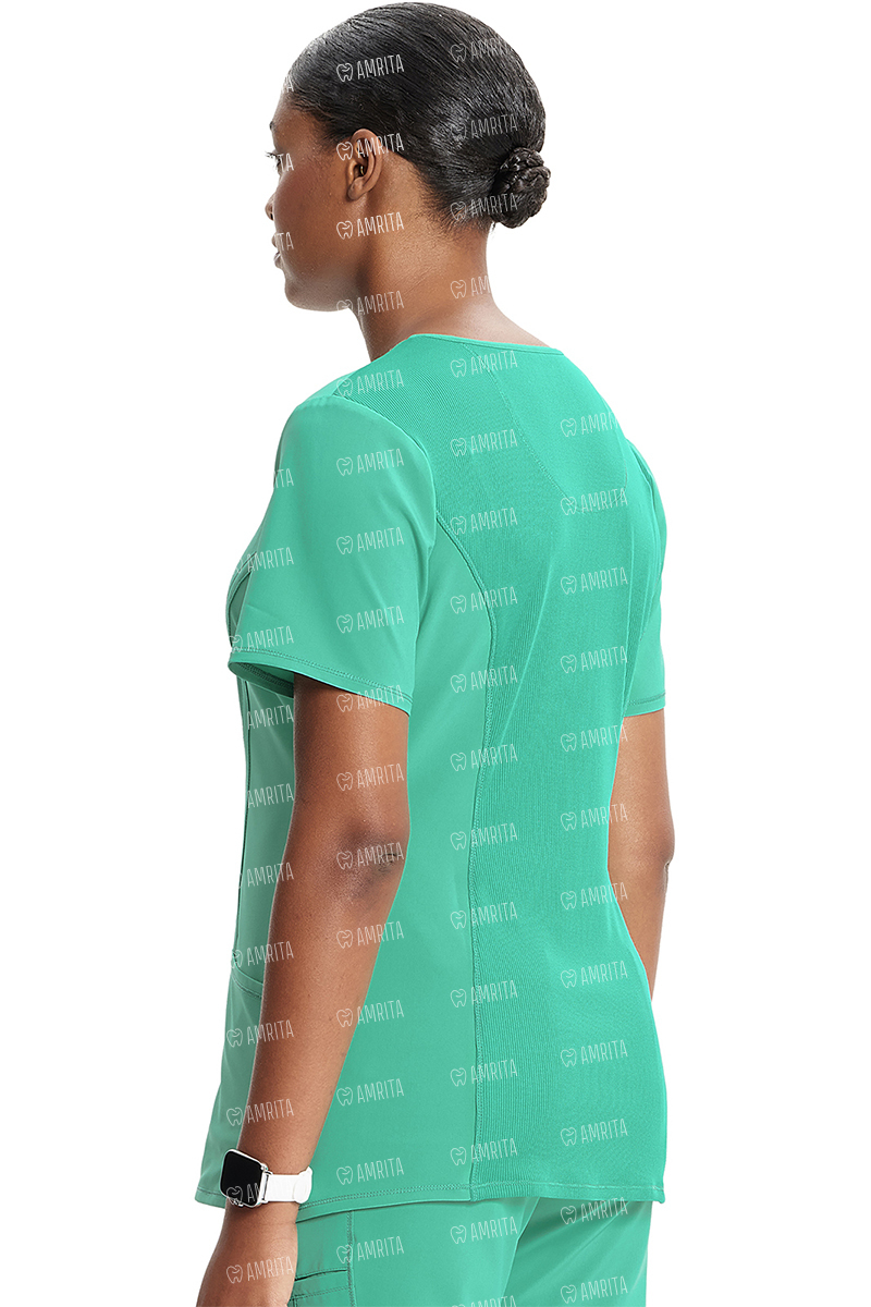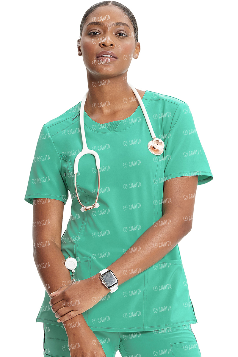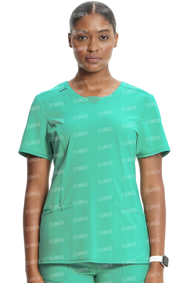 Женский медицинский топ Cherokee 2624A — современный топ с круглым вырезом и вставкой из трикотажа. Спереди топ дополнен плечевыми кокетками, петлей для бейджа на правом плече, двумя накладными карманами, одним внутренним карманом и боковыми вентиляционными отверстиями.