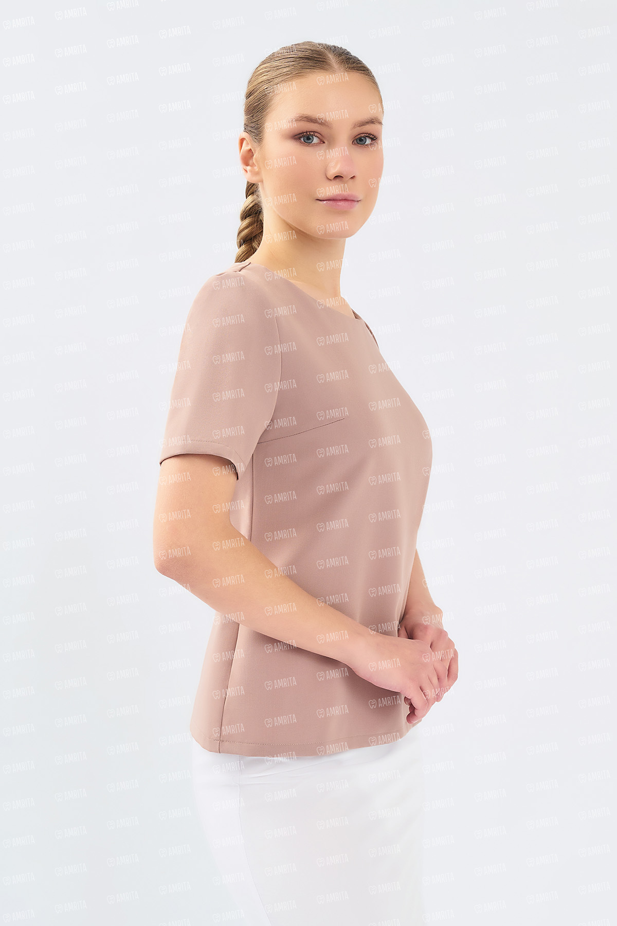 В основе дизайна — полуприлегающий крой, который формируется за счет вытачек и создает точный и женственный силуэт. Аккуратный круглый вырез и короткий рукав поддерживают лаконичный и универсальный характер модели, делая ее безупречной базой для любого профессионального гардероба.