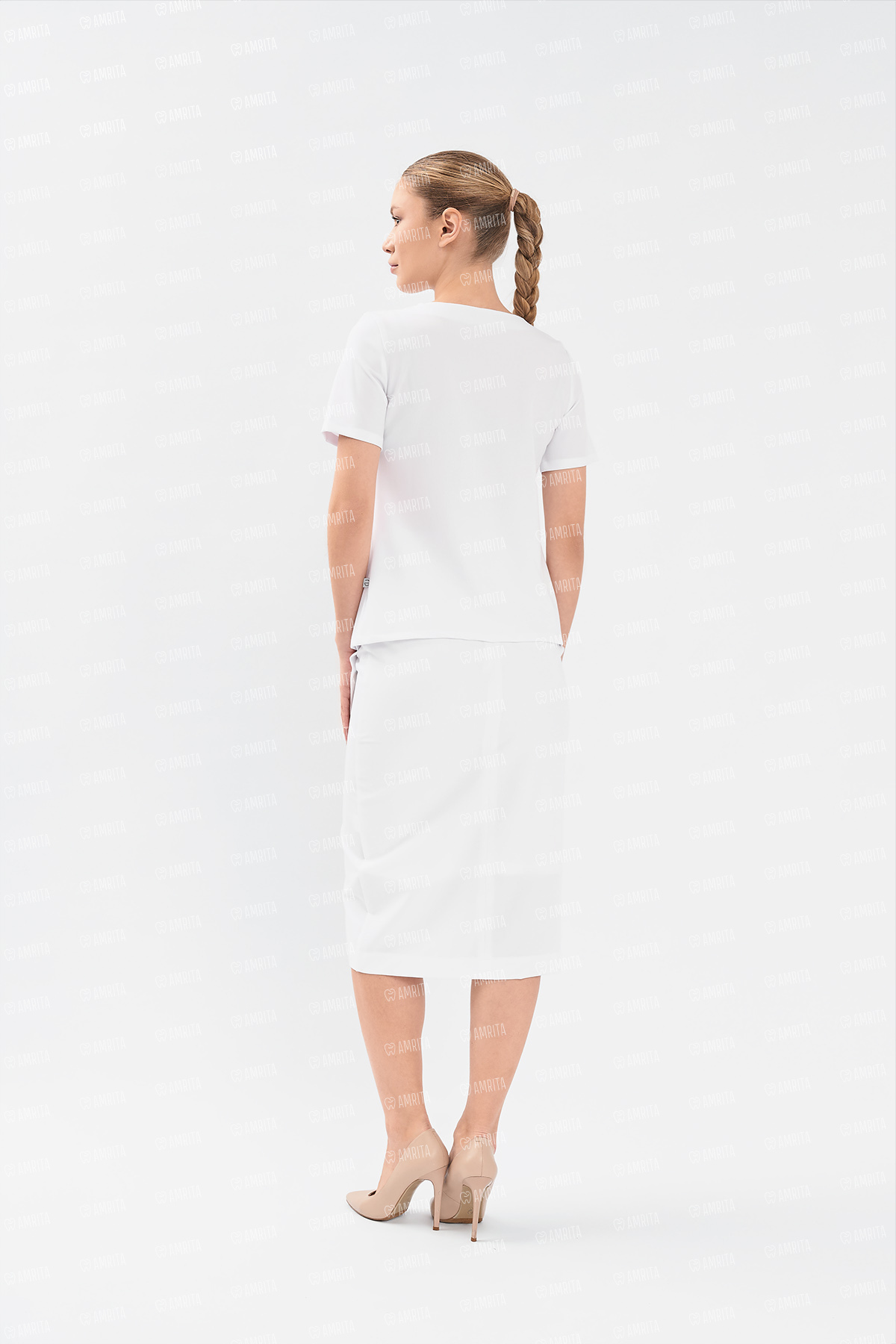 В основе дизайна — полуприлегающий крой, который формируется за счет вытачек и создает точный и женственный силуэт. Аккуратный круглый вырез и короткий рукав поддерживают лаконичный и универсальный характер модели, делая ее безупречной базой для любого профессионального гардероба.