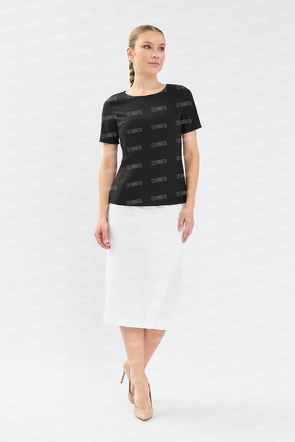В основе дизайна — полуприлегающий крой, который формируется за счет вытачек и создает точный и женственный силуэт. Аккуратный круглый вырез и короткий рукав поддерживают лаконичный и универсальный характер модели, делая ее безупречной базой для любого профессионального гардероба.