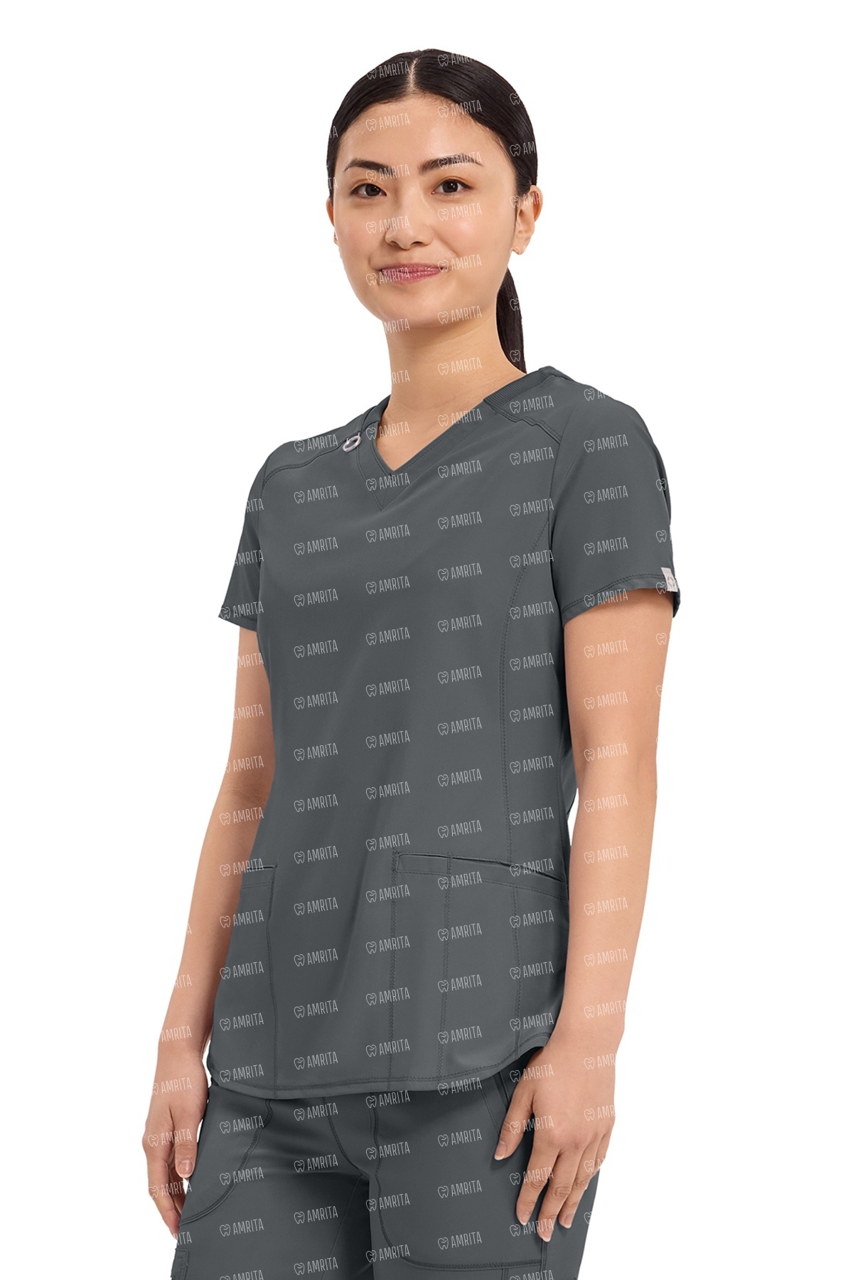 Функциональность модели продумана для удобства специалиста: предусмотрены два передних прорезных кармана, при этом левый карман дополнен специальным швом для фиксации ручки. Закругленный нижний край и боковые разрезы обеспечивают дополнительную свободу движений и позволяют топу аккуратно садиться по бедрам.