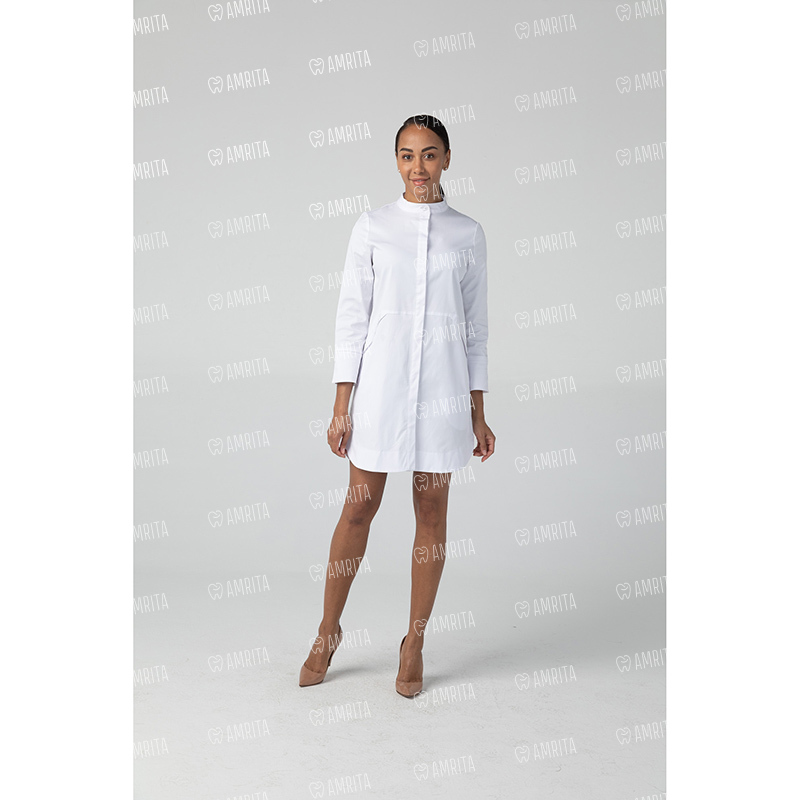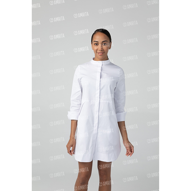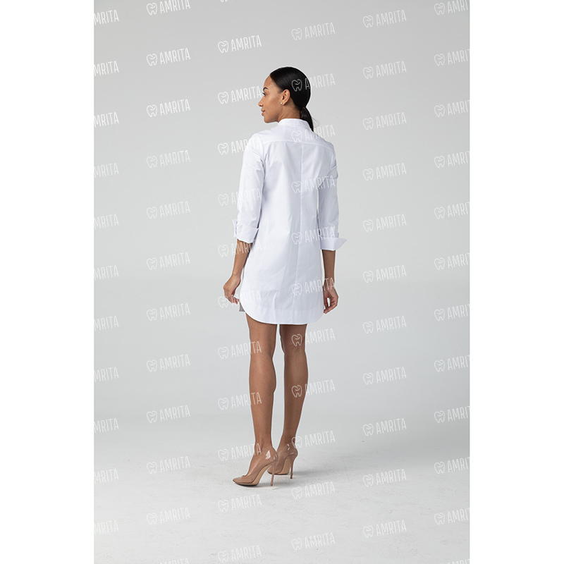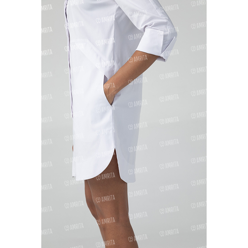 Медицинское платье-рубашка бренда Dr.Nice имеет прямой крой, воротник-стойку и застегивается на кнопки спереди. Модель дополнена двумя боковыми карманами.