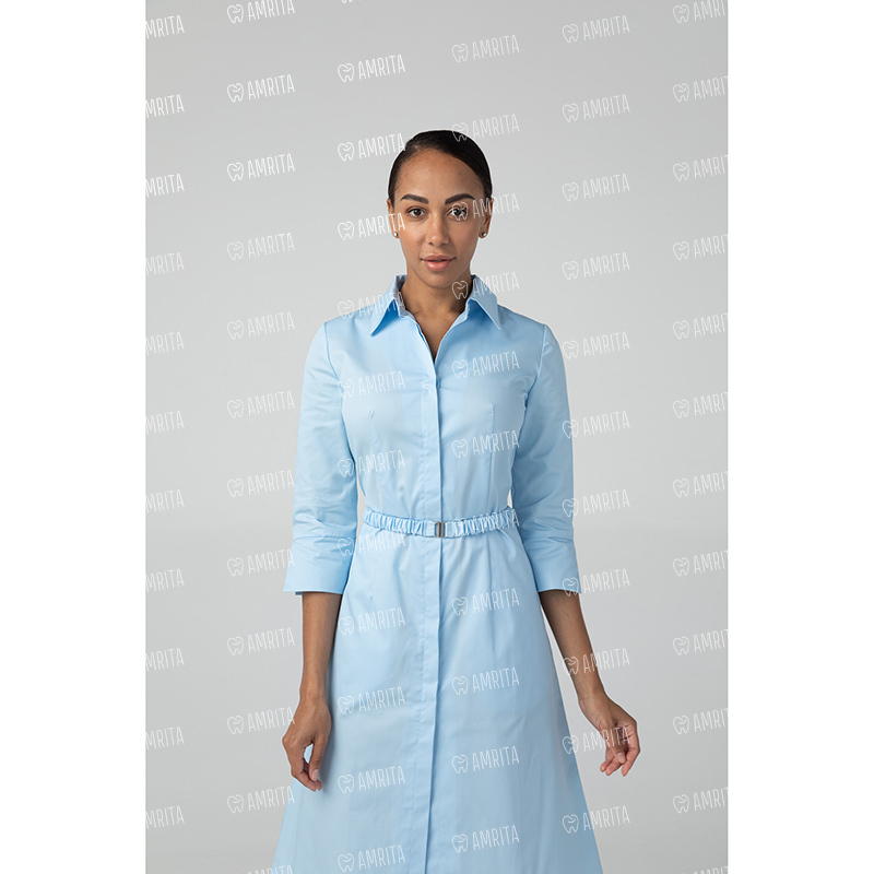 Платье-халат Dr.Nice с рукавом ¾ с отворачивающимися манжетами выполнено в классическом крое на супатной застежке. Модель дополнена двумя карманами в боковых швах и эластичным поясом с пряжкой.
