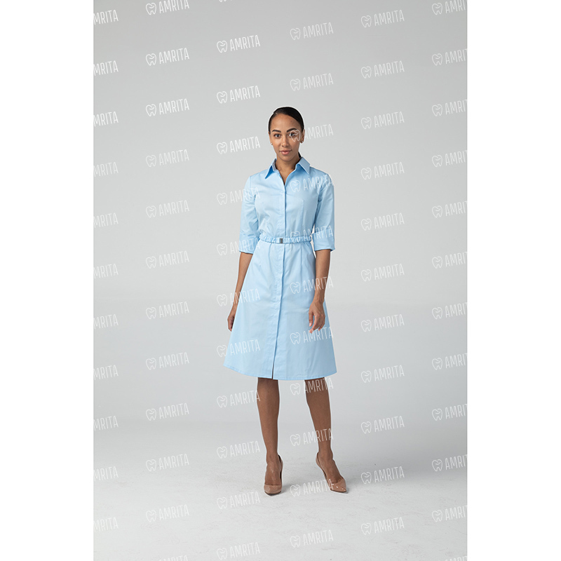 Платье-халат Dr.Nice с рукавом ¾ с отворачивающимися манжетами выполнено в классическом крое на супатной застежке. Модель дополнена двумя карманами в боковых швах и эластичным поясом с пряжкой.