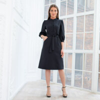 Платье Beauty бренда Dr.Nice имеет длину миди, рукав ¾, а также воротник-стойку и планку. Модель дополнена карманами, которые расположены в рельефах. Идёт в комплекте с поясом.