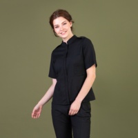 Женская медицинская рубашка поло Dr.Nice с коротким рукавом и отложным воротничком. Застежка на пуговицах, в боковых швах имеются разрезы.