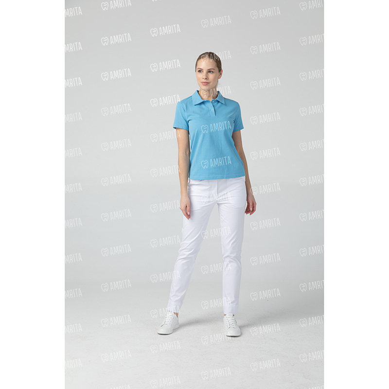 Женская медицинская рубашка поло Dr.Nice с коротким рукавом и отложным воротничком. Застежка на пуговицах, в боковых швах имеются разрезы.
