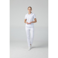 Женская медицинская рубашка поло Dr.Nice с коротким рукавом и отложным воротничком. Застежка на пуговицах, в боковых швах имеются разрезы.