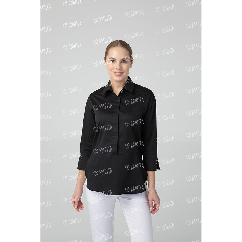 Женская туника Dr.Nice выполнена в современном крое с застежкой-молнией на спине. Длина рукава регулируется отворотом с закреплением пуговицей сбоку. По бокам туники имеются разрезы, дополнена модель двумя накладными карманами спереди.