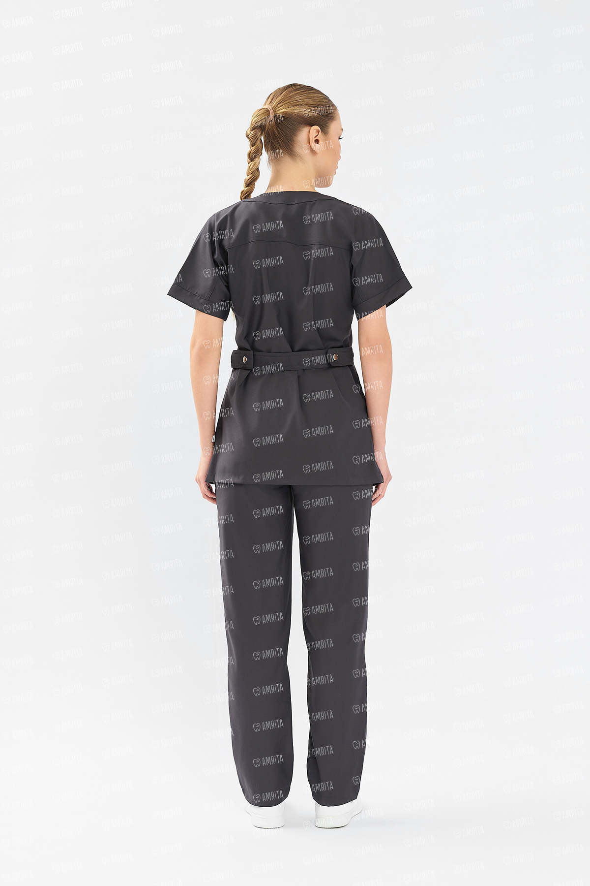 В основе дизайна — приталенный силуэт, который деликатно акцентирован регулируемым поясом-хлястиком на талии. Элегантный воротник-стойка с V-образным вырезом формирует утонченную линию шеи, а кокетка на плечах задает строгую геометрию верха. Мягкие складки от пояса добавляют образу легкости, а боковые карманы, скрытые в швах, поддерживают функциональность модели.
