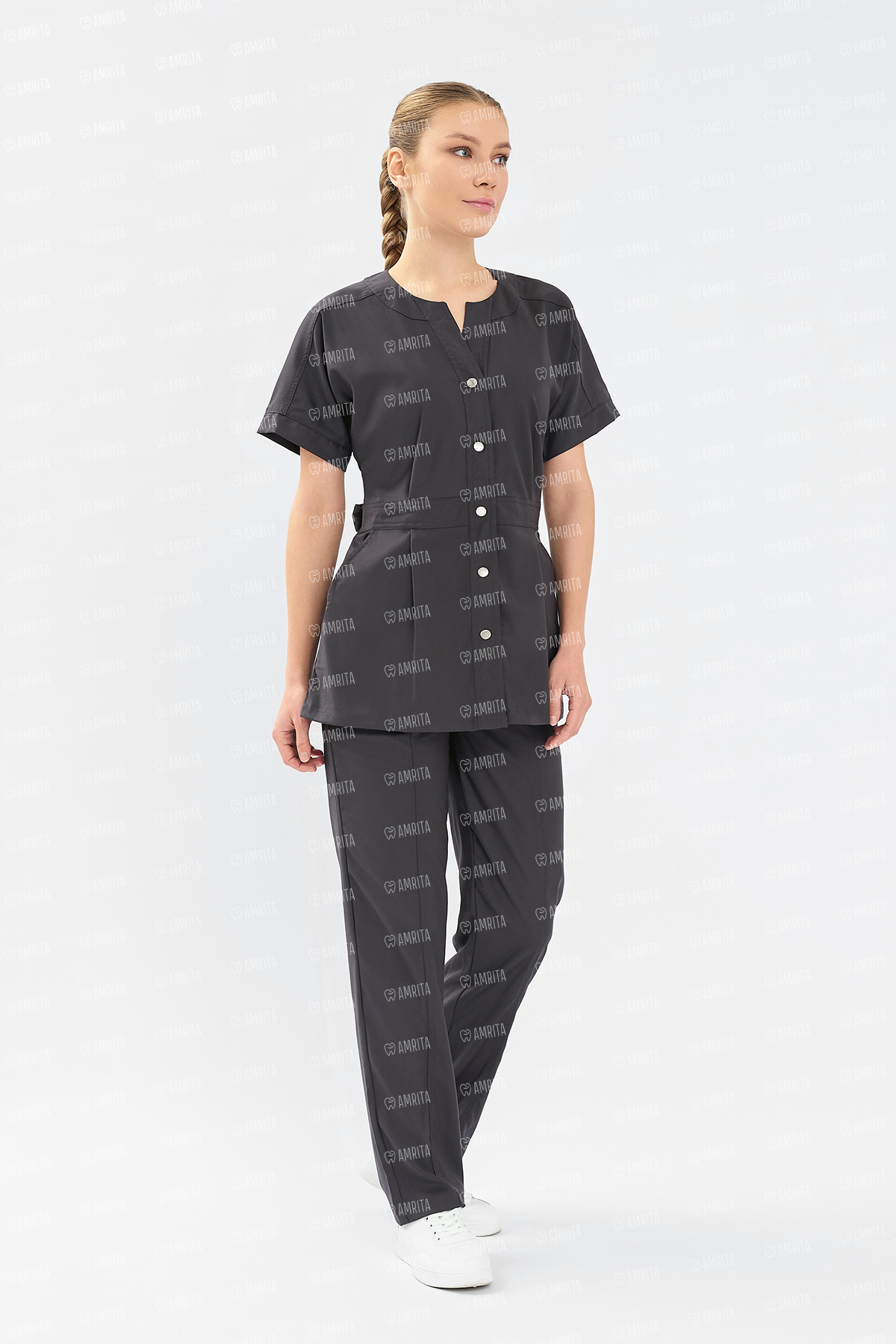 В основе дизайна — приталенный силуэт, который деликатно акцентирован регулируемым поясом-хлястиком на талии. Элегантный воротник-стойка с V-образным вырезом формирует утонченную линию шеи, а кокетка на плечах задает строгую геометрию верха. Мягкие складки от пояса добавляют образу легкости, а боковые карманы, скрытые в швах, поддерживают функциональность модели.