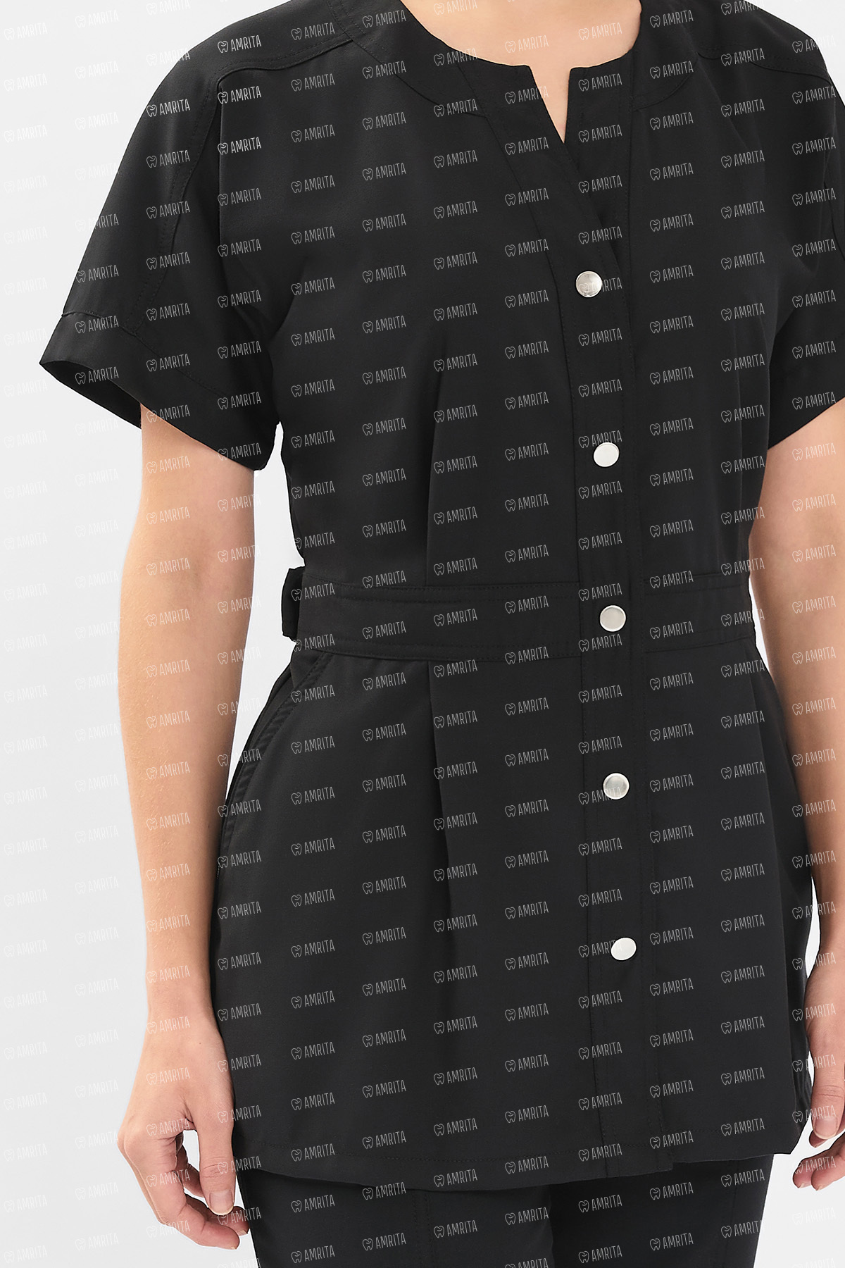 В основе дизайна – приталенный силуэт, который деликатно акцентирован регулируемым поясом-хлястиком на талии. Круглый воротник с V-образным вырезом изящно подчеркивает линию шеи, а кокетка на плечах задает правильную геометрию плечевого пояса. Мягкие складки от пояса добавляют образу легкости, а боковые карманы, скрытые в швах, поддерживают функциональность модели.