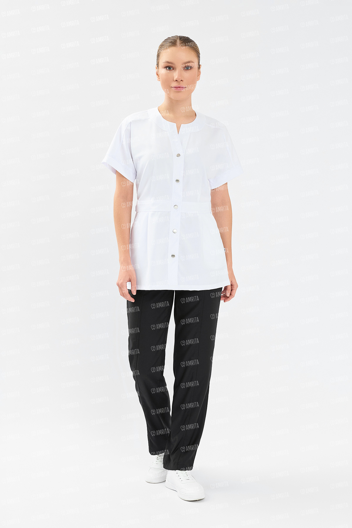 В основе дизайна — приталенный силуэт, который деликатно акцентирован регулируемым поясом-хлястиком на талии. Элегантный воротник-стойка с V-образным вырезом формирует утонченную линию шеи, а кокетка на плечах задает строгую геометрию верха. Мягкие складки от пояса добавляют образу легкости, а боковые карманы, скрытые в швах, поддерживают функциональность модели.